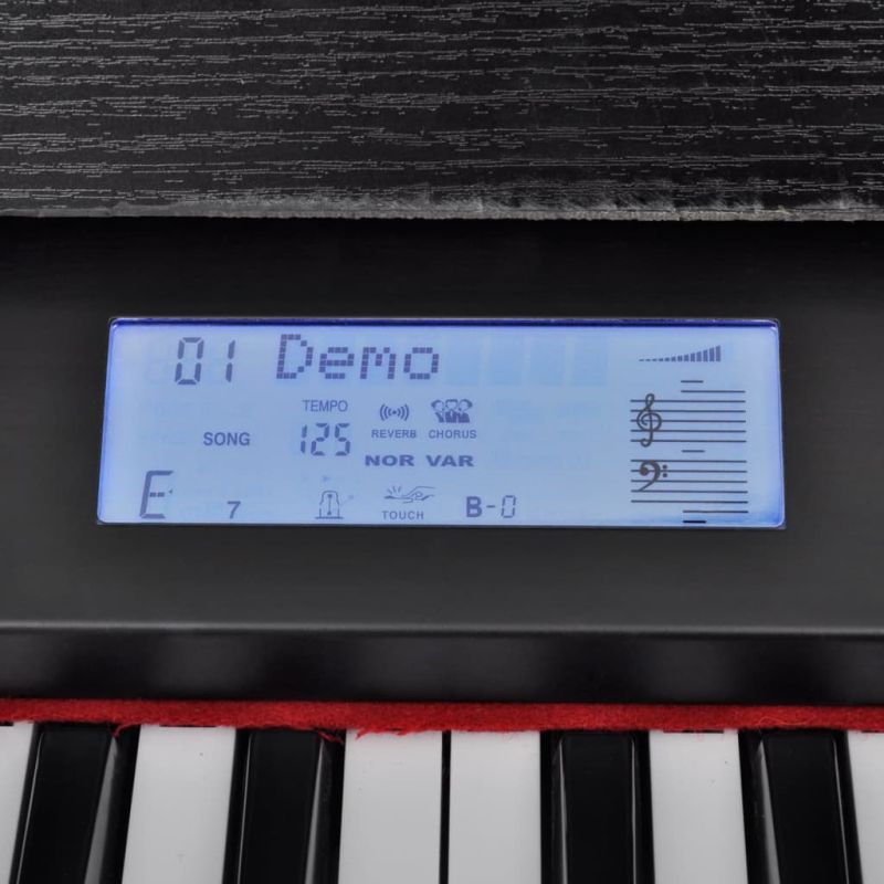 Това електрическо пиано се отличава с перфектно качество на звука и широка гама от възможности и функции, както и с 88 стандартни клавиша за пиано и поставка за нотни листове. На него лесно се свири и е чудесен избор за напълно начинаещи или музиканти на средно ниво. Изработено е от висококачествени материали и ще го ползвате дълги години. То има 128 вида звуци и 100 авто съпроводни стилове, които са отлично програмирани. Има още 50 демо песни. Можете да използвате и функцията за запис На това стилно пиано се свири много лесно. Всеки функционален бутон е обозначен много ясно на интерфейса. Докато свирите на пианото, можете да поставите нотите си листове на поставката. Има жак за слушалки, което ви гарантира, че няма да бъдете безпокоени от други шумове, когато свирите на електронното пиано. Подходящо е не само за възрастни, но е и идеален подарък за деца! Този уред не е предназначен за използване от лица (включително деца) с намалени физически, сетивни или умствени способности или с недостатъчен опит и познания, освен ако не са получили надзор или инструкции за използването на уреда от лице, отговорно за тяхната безопасност. Този продукт не е играчка. Не позволявайте на деца да си играят с уреда.
