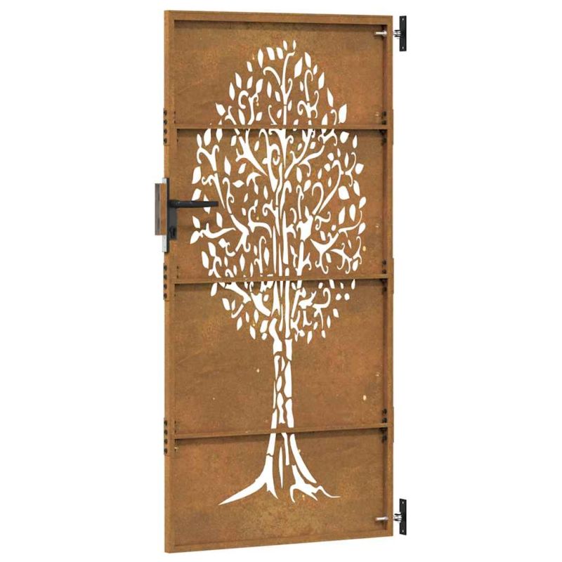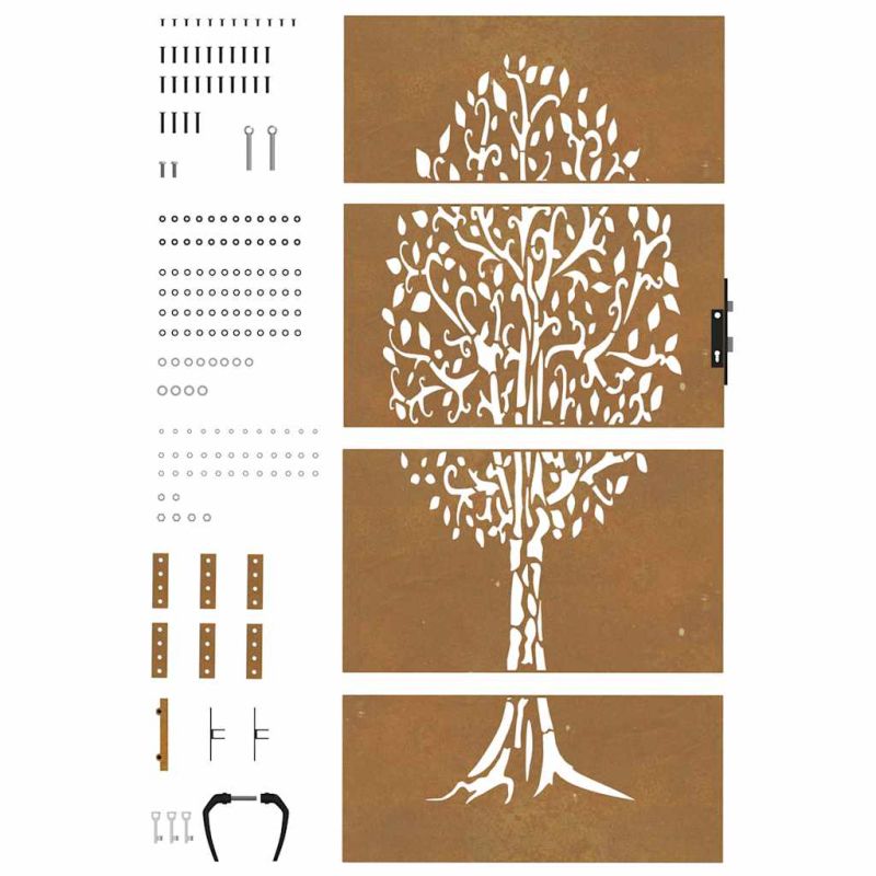Тази градинска порта, отличаваща се с перфектна комбинация от здравина и елегантност, е идеална врата за оградата около вашата градина или вътрешен двор. Издръжлив материал: Металната врата е изработена от кортенова стомана. Кортенова стомана, известна също като патинираща стомана. Тя е антикорозионна по своята същност. Развива ръждив защитен слой срещу корозия при първото излагане на атмосферни условия. Следователно не е необходимо да я боядисвате. Това може да ви помогне да спестите разходи за поддръжка и ремонт. Отличителният кафяв цвят на кортеновата стомана със сигурност ще привлече вниманието. И накрая, патиниращата стомана е изключително издръжлива и ще издържи изпитанието на времето. Лазерно изрязан дизайн: Страничната порта има красив лазерно изрязан дизайн, който добавя специален чар към вашия дом.Заключваща се система: Стоманената порта е оборудвана със заключваща се система за допълнителна сигурност. Добре е да се знае:Този продукт трябва да бъде сглобен.Този продукт все още не е ръждясал и когато го получите ще има нормален метален цвят, но ръждата ще се появи с течение на времето. Можете да ускорите процеса на ръждясване, като го напръскате със сапунена и солена вода. За да запазите дрехите си от петна, избягвайте контакт с образуващия се слой ръжда. Не използвайте този артикул, ако някой от компонентите е счупен, скъсан или липсва.