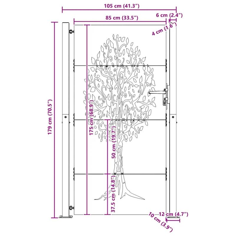 Тази градинска порта, отличаваща се с перфектна комбинация от здравина и елегантност, е идеална врата за оградата около вашата градина или вътрешен двор. Издръжлив материал: Металната врата е изработена от кортенова стомана. Кортенова стомана, известна също като патинираща стомана. Тя е антикорозионна по своята същност. Развива ръждив защитен слой срещу корозия при първото излагане на атмосферни условия. Следователно не е необходимо да я боядисвате. Това може да ви помогне да спестите разходи за поддръжка и ремонт. Отличителният кафяв цвят на кортеновата стомана със сигурност ще привлече вниманието. И накрая, патиниращата стомана е изключително издръжлива и ще издържи изпитанието на времето. Лазерно изрязан дизайн: Страничната порта има красив лазерно изрязан дизайн, който добавя специален чар към вашия дом.Заключваща се система: Стоманената порта е оборудвана със заключваща се система за допълнителна сигурност.Стабилна основа: 4-те монтажни отвора в основата на стълба на портата ви позволяват да го фиксирате към земята за допълнителна стабилност. Добре е да се знае:Този продукт трябва да бъде сглобен.Този продукт все още не е ръждясал и когато го получите ще има нормален метален цвят, но ръждата ще се появи с течение на времето. Можете да ускорите процеса на ръждясване, като го напръскате със сапунена и солена вода. За да запазите дрехите си от петна, избягвайте контакт с образуващия се слой ръжда. Не използвайте този артикул, ако някой от компонентите е счупен, скъсан или липсва.