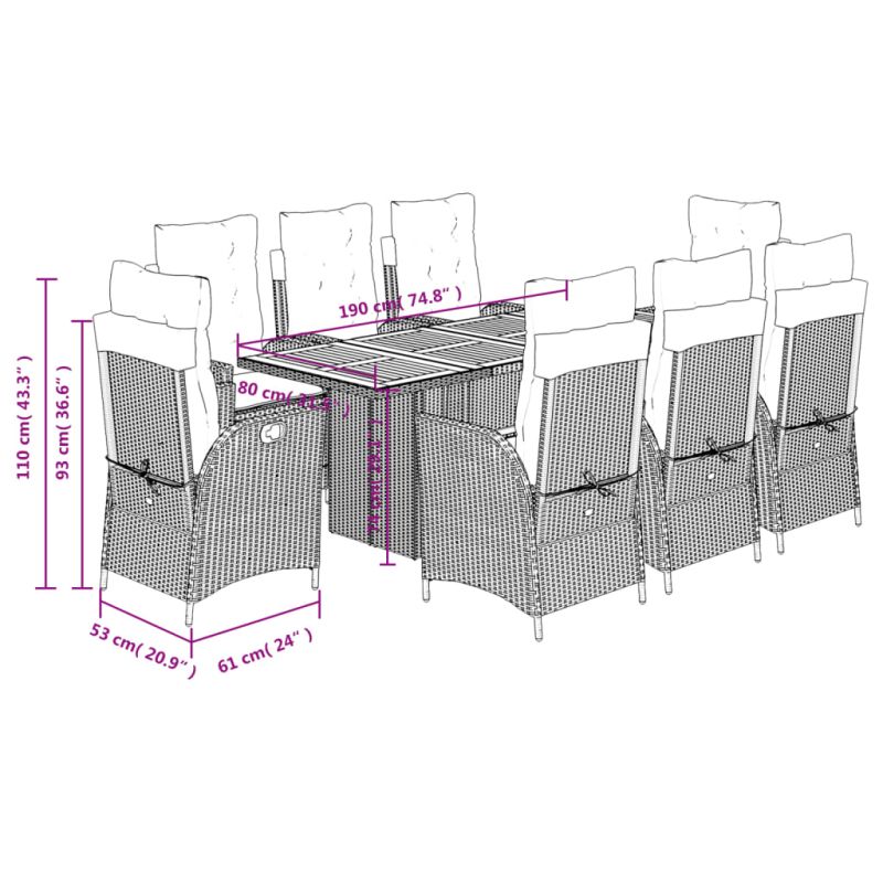 Този градински трапезен комплект е чудесен избор за вечеря на открито или просто за почивка в градината, задния двор или във вътрешния двор. Издръжлив материал: PE ратан, известен също като полиратан, е здрав синтетичен материал с малко необходима поддръжка, който прилича на естествен ратан. Той е лек, лесен за почистване и често се използва за външни мебели поради своята издръжливост и устойчивост на атмосферни влияния.Регулируема облегалка: Този градински стол има дръжка. Можете да регулирате облегалката във всяка позиция чрез издърпване на дръжката и бързо да я върнете в първоначалната ѝ позиция.Удобна седалка: Тази мебел за открито, снабдена с плътно подплатени възглавници, предлага удобство при сядане.Калъф, който може да се сваля и може да се пере: Тези възглавници за седалки имат подвижни калъфи за лесно пране и поддръжка. Възглавниците за облегалките имат калъф отзад за лесно закрепване към облегалките.Стабилен и лесен за почистване плот: Тази градинска маса има плот от акациево дърво, който е здрав, издръжлив и лесен за почистване с влажна кърпа. Добре е да се знае: За да сте сигурни, че вашите външни мебели ще останат красиви, ви препоръчваме да ги защитите с водоустойчиво покривало. Максимално 110 кг на седалка. Съобразете се с риска от открит огън и други източници на силна топлина в близост до продукта.
