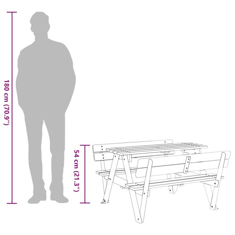 Тази маса за пикник е идеална за вътрешни дворове, градини и открити пространства, като осигурява удобно и привлекателно място за почивка и забавление на децата и техните приятели. Комплект маса и пейки 2-в-1: Масата за пикник с пейки е идеална за детски партита и събирания, тъй като осигурява достатъчно място за храна, напитки и аксесоари, както и удобни места за сядане, за да могат децата да се наслаждават на детските си спомени.Надежден и стабилен материал: Тази маса за пикник е изработена от масивна чамова дървесина, което гарантира стабилност, издръжливост и дълготрайност.Здрава и стабилна структура: Тази маса за пикник има "W"-образна структура, която осигурява стабилност и безопасност за децата, занимаващи се с различни дейности.Отвор за чадъра: Плотът разполага с отвор за чадър, който дава възможност за добавяне на чадър за сянка в слънчеви дни. Добре е да се знае:Този продукт не е подходящ за употреба при лоши метеорологични условия, като силен вятър, силен дъжд, сняг, бури и др.Тази доставка включва само една маса за пикник с вградени пейки; чадърът не е включен. Посетете този магазин, за да намерите идеалния подходящ чадър за открито! Предупреждение: НЕ поставяйте този продукт близо до прозорец, тъй като той може да бъде използван като стълба от деца и те да паднат от прозореца. Бъдете внимателни по отношение на риска от открити огньове и други източници на силна топлина в близост до продукта. НЕ поставяйте този продукт близо до прозорец, където шнуровете от щорите или завесите могат да удушат дете. Предупреждение! Да се сглобява единствено от възрастни. Съхранявайте продукта и всички негови части далеч от деца до момента на сглобяването. Уверете се, че сте осъзнали цялата отговорност, тъй като несглобеният продукт съдържа малки части и потенциално опасни остри ръбове. Предупреждение! Да се използва под директния надзор на възрастни. Предупреждение! Максималната товароносимост е 80 кг. Предупреждение! Този продукт е подходящ само за деца над 3-годишна възраст.