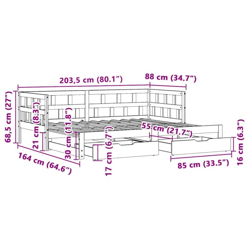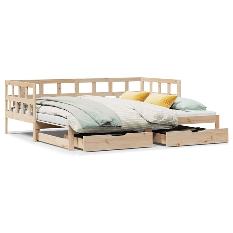 Това канапе 2-в-1 с изтеглящо разтегателно легло, което служи едновременно като диван и легло, е практично и атрактивно допълнение към вашата всекидневна или спалня. Функционална мебел: Канапето функционира като диван през деня и лесно се превръща в двойно легло през нощта чрез издърпване на механизма за изтеглящо разтегателно легло, осигурявайки удобно решение за настаняване на гости и увеличаване на пространството.Стабилна и дълготрайна рамка: Масивната борова дървесина е известна със своята здравина и издръжливост. Нейните прави зърна и отличителни възли допринасят за рустик чара ѝ.Ламели за оптимална опора: Диванът е снабден с ламели, за да предложи основна опора и дишане на вашия матрак.Достатъчно място за съхранение: Това легло за гости има две чекмеджета, които осигуряват достатъчно място за съхранение на вашите дрехи, чорапи, играчки, възглавници и др. Добре е да се знае:Матраците не са включени в това легло. Ние предлагаме разнообразна селекция от матраци. Можете да проверите нашия магазин за подходящи матраци.