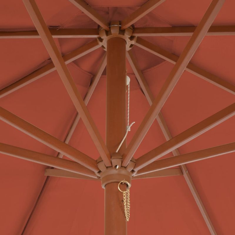 Този елегантен дървен градински чадър е перфектно решение за създаване на сянка, с което да се предпазите от вредните UV лъчи на слънцето. Изработено от неизбледняващ полиестер, предпазващ от ултравиолетовите лъчи, покривалото на чадъра осигурява оптимална защита срещу слънцето и се почиства лесно. Диаметърът на пръта от 48 мм позволява монтиране върху наличната стойка или в средата на масите с дупки. Здравият дървен прът и 8-те издръжливи спици правят чадъра много стабилен и устойчив. Градинският чадър се отваря и затваря лесно благодарение на манивелата. Артикулът се сглобява лесно. Моля, забележете, че препоръчваме обработката на текстила на чадъра с хидроизолационен спрей, ако е подложен на силни валежи.