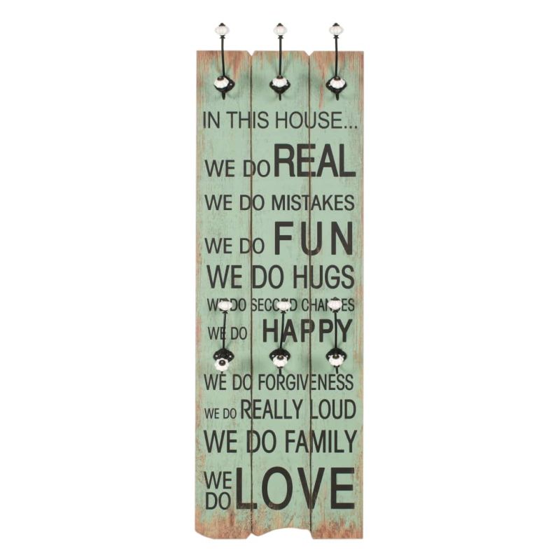 Със своя принт във винтидж стил "In this house…we do real we do mistakes we do fun we do hugs we do second chances we do happy we do forgiveness we do really loud we do family we do love" тази стенна закачалка с 6 кукички ще се превърне във впечатляващ акцент, който веднага ще бъде забелязван от вашите гости. Закачалката е изработена от стабилен МДФ. Проектирана с два реда по три изящни метални куки, закачалката за дрехи разполага с достатъчно пространство за вашите палта, чанти, шалове, шапки или други дребни аксесоари. С две точки за закрепване на гърба, закачалката за дрехи може лесно да се монтира към стената. Монтажът е лесен. Доставката включва и необходимите монтажни материали.