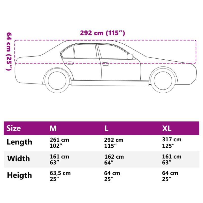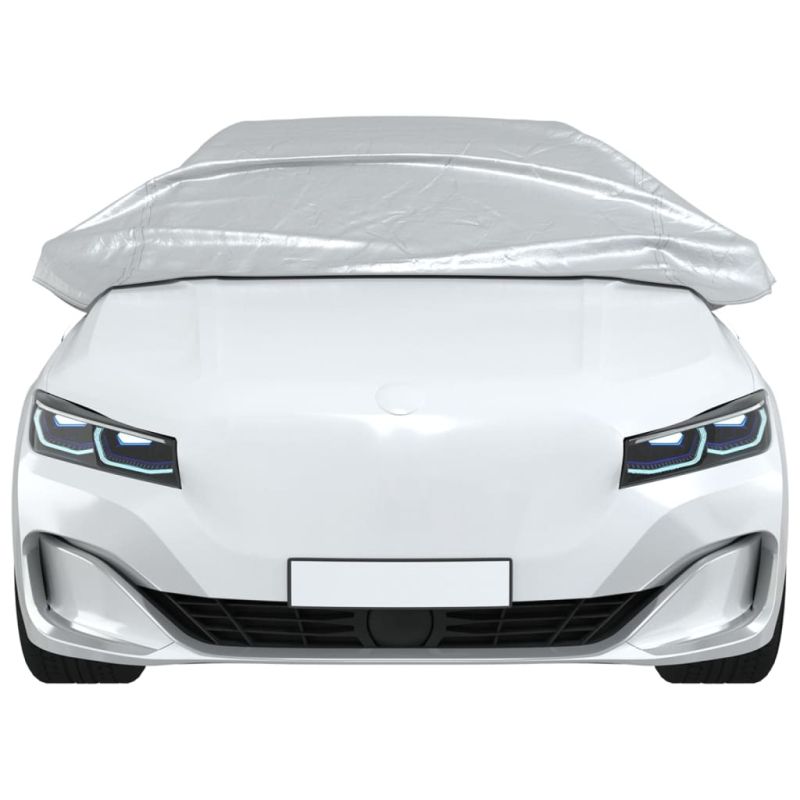 Това половин покривало предпазва автомобила ви от ултравиолетови лъчи, драскотини, сняг, дъжд, замръзване, прах, паднали листа, промишлено замърсяване и птичи изпражнения, което го прави идеално за употреба на закрито и на открито. Многослоен материал: Покривалото за автомобил е изработено от три слоя: алуминиево фолио, PEVA и мек памук, които осигуряват отлична водоустойчивост, защита от прах, UV защита и устойчивост на надраскване.Сребристо покритие за топлоизолация: Сребристата повърхност на покривалото за автомобил отразява повече слънчева светлина и UV лъчи, като запазва автомобила ви по-хладен в горещо време. Това помага да се предпази интериорът на автомобила от топлинни повреди.Ветроустойчив дизайн: С помощта на еластичните ленти с кукички покривалото за кола може да бъде здраво прикрепено към всяка джанта и шаси, което го предпазва от издухване.Лесно съхранение: Покривалото за кола се предлага с удобна чанта за съхранение, което го прави лесно за съхранение, когато не се използва. Добре е да се знае:Преди да закупите, моля вземете точни размери на вашия автомобил, за да сте сигурни, че сте избрали правилния размер.