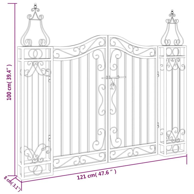 Тази декоративна градинска порта с елегантни стълбове е идеален вход за оградата около вашата градина или вътрешен двор. Издръжлив материал: Металната градинска порта е изработена от ковано желязо и прахово боядисана за дълготрайна издръжливост. Кованото желязо е вид желязо, което е здраво, ковко, устойчиво на корозия и пластично, което го прави идеално за приложения на открито.Система за заключване: Портата от ковано желязо е снабдена с панта с болт за бързо заключване, за да се повиши сигурността.Дизайн със стълбове: Стълбовете от ковано желязо ви помагат да постигнете здрава опорна система за порта и да оформите атрактивно допълнение към вашия двор или градина.Елегантен вид: Елегантните форми и декоративните акценти правят оградната врата визуален акцент на открито.