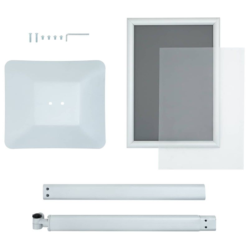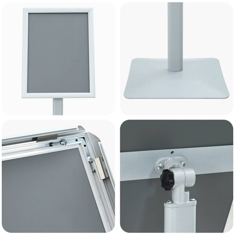 Подставката за постери е практично решение за показване на печатни материали в бизнес и търговски среди. Здравата ѝ основа и регулируемият дисплей предлагат ясна презентация на информацията или рекламните графики. Подходяща е за приемни, търговски площи и изложбени настройки, предлагайки функционално решение, където се изисква гъвкавост и яснота. Състав на материала: Стойката е с солидна чугунена основа и алуминиева рамка, осигуряващи стабилност. Дисплейният панел е от PS платка с PVC защитно фолио за гладка повърхност, идеална за смяна на постерите. Регулируема функция на дисплея: С въртящ механизъм, стойката предлага 360° въртене и 180° наклон, осигурявайки удобство за различни позиции и ъгли на гледане. Широко приложение: Подходяща за офис приемни, търговски пространства, изложби и други места. Нейният неутрален дизайн позволява лесна интеграция, без да отвлича вниманието от съдържанието. Необходими за сглобяване: Стойката идва като готова единица и може да се сглоби лесно с основни инструменти. Лесна поддръжка: Просто едно бърсане с влажна кърпа поддържа чист и представителен вид.