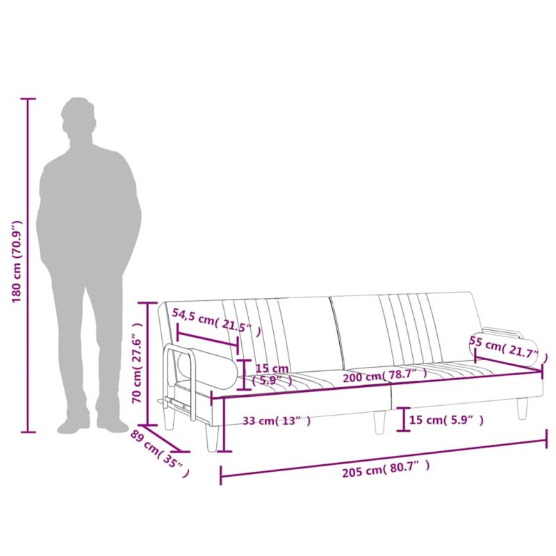 Това разтегателно канапе е перфектно за гости с преспиване, като същевременно осигурява удобно място за сядане през деня. Меко кадифе: Кадифето е мека и луксозна материя, която се отличава с гъста купчина равномерно отрязани влакна за гладка повърхност. Тъканта от кадифе се отличава с подчертано меко усещане, което я прави приятна на допир. Регулируема облегалка: Можете да натиснете двете отделни облегалки на канапето частично или напълно надолу, за да създадете идеално място за дрямка или двойно легло. Удобна седалка: Разтегателният диван е много удобен с дебело подплатени седалки, подлакътници и облегалки.Практични възглавници: Тези възглавници не само украсяват декора ви, но могат да добавят допълнителен комфорт, когато седите или лежите. Здрава и стабилна рамка: Рамката от шперплат на дивана осигурява здравина и стабилност. Добре е да се знае:За да бъде сглобяването възможно най-лесно, всеки продукт се доставя с ръководство.