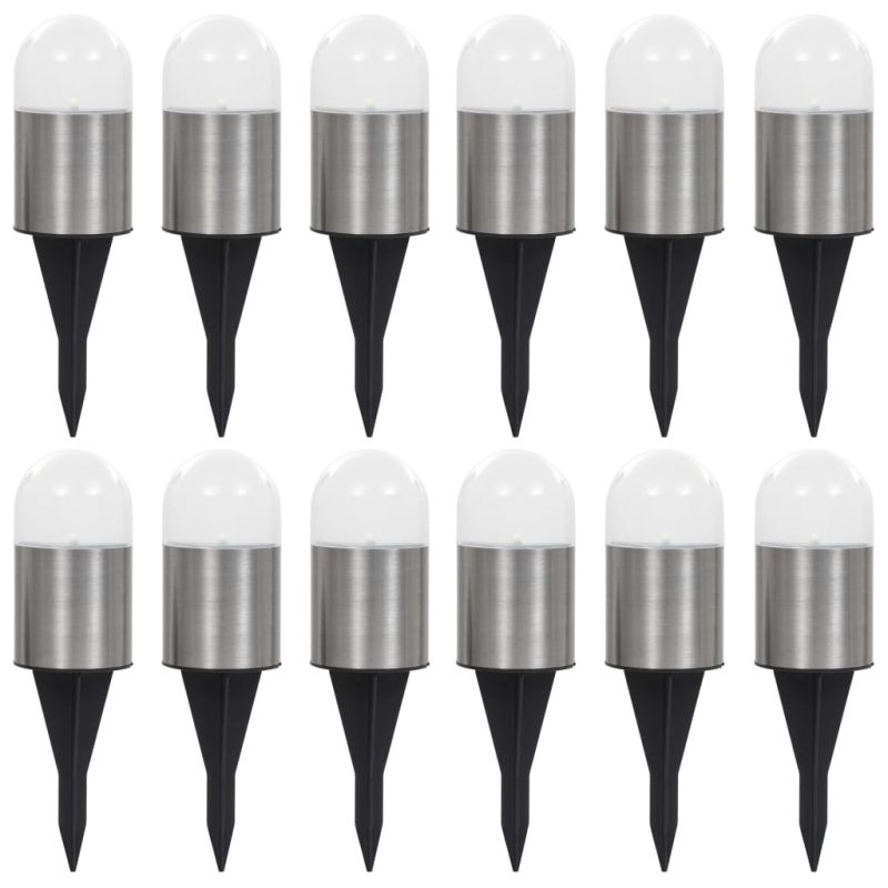 Тези соларни наземни лампи са идеални за осветление за къщи, градини, вътрешни дворове, пътеки и балкони. Всяка соларна лампа е оборудвана с Ni-MH батерия, зареждана от слънчевата светлина. През деня лампите автоматично абсорбират слънчевата енергия и я преобразуват в електричество за зареждане на батерията. Във всяка лампа има по един LED светодиод, който излъчва ярка светлина вечер. Светлината ще се включи автоматично, когато се стъмни и ще се изключи през деня. Нашите соларни лампи са енергоспестяващи и изискват малко поддръжка. Не е необходимо да плащате сметка за електричество за лампата, тъй като тя се захранва от слънчева енергия. Соларните лампи са проектирани да бъдат водоустойчиви и подходящи за ежедневна употреба на открито. Всички елементи са лесни за сглобяване. Доставката включва 12 соларни наземни лампи.