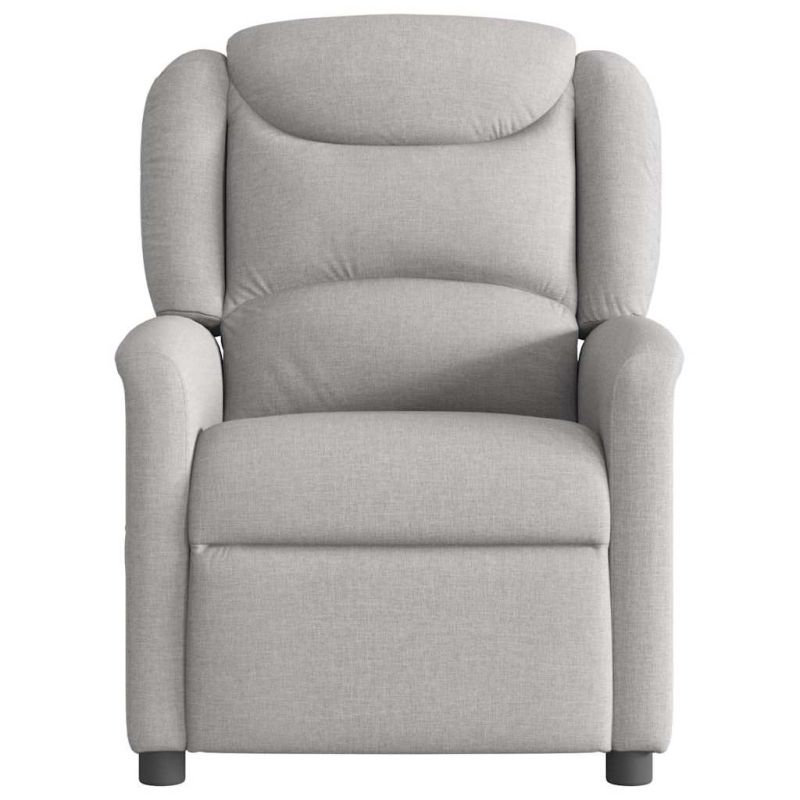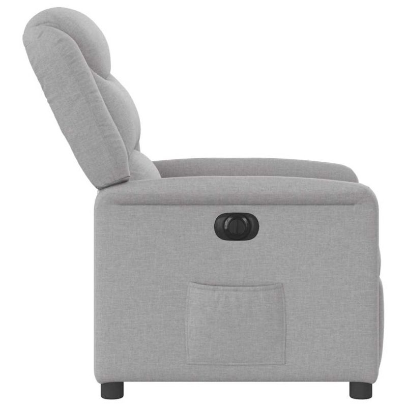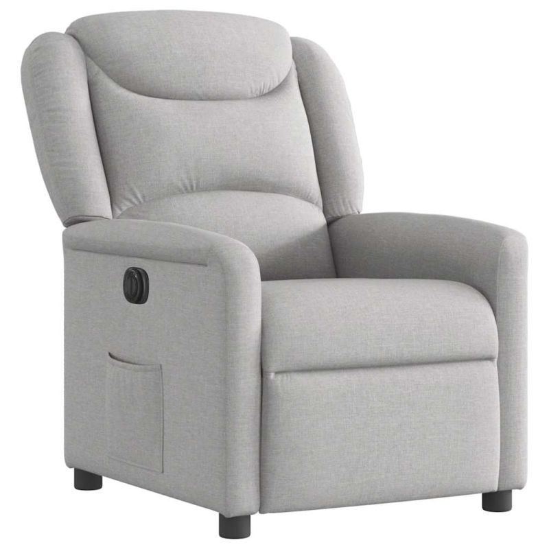 Облегнете се и се отпуснете в този изключително комфортен електрически наклоняем стол! Електрическа функция за накланяне: Този стол с облегалка е оборудван с електрически мотор, който помага автоматично да регулирате поставката за крака и облегалката до произволна позиция според вашето удобство с просто натискане на бутона отстрани на стола. Тази функция позволява максимален наклон от 135 градуса. Освен това облегалката може да се върне автоматично на първоначалното си място с лесно натискане на бутона.Удобно седене: Дебело подплатената седалка, облегалка и широки подлакътници, покрити с текстил, осигуряват уютно и топло усещане, което ви кара да се чувствате като в прегръдка, докато седите. Тъканта се отличава със семпъл и изчистен вид и е дишаща и издръжлива.Удобен страничен джоб: Този фотьойл има страничен джоб, за да държите основните си вещи леснодостъпни.Здрава и стабилна рамка: Рамката, изработена от дърво и метал, осигурява здрава структура и стабилност. Този накланящ се фотьойл е удобен и издръжлив.