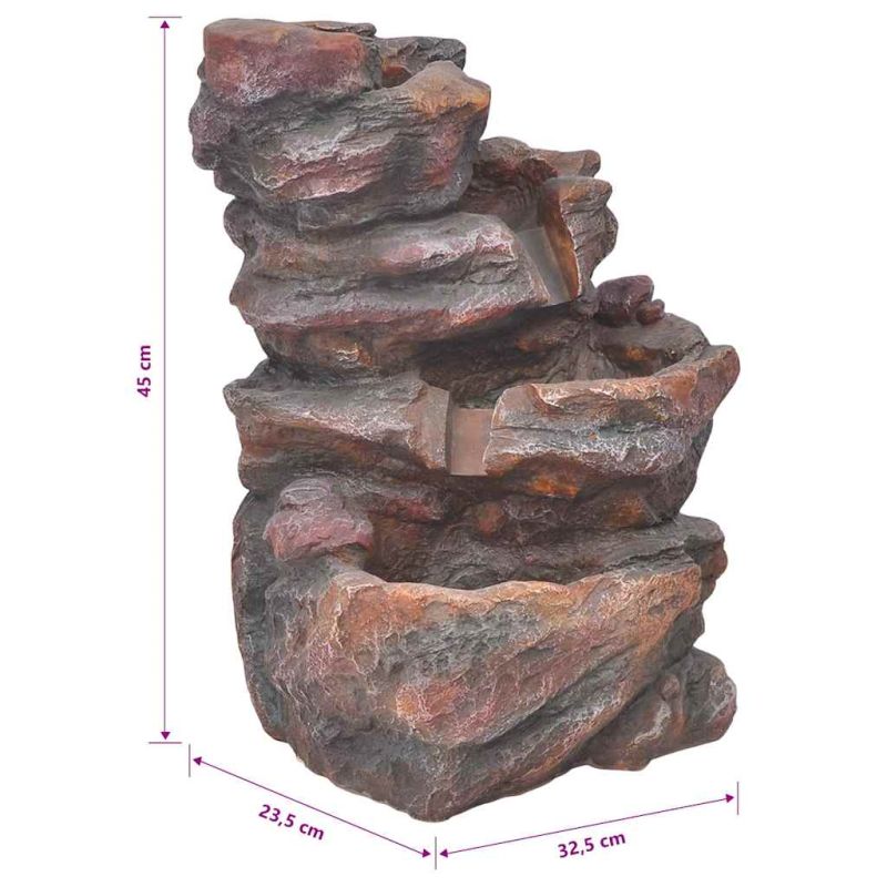 Този LED вътрешен фонтан е идеален избор за добавяне на естествена атмосфера към вашето жизнено пространство.Тази тънкоструйна водна скулптура ще допълни всеки интериор. Тя е осветена със светодиоди, което прави един зашеметяващ визуален ефект, особено през нощта. Изработен от полиестерна смола, фонтанът е устойчив на ултравиолетови лъчи, което означава, че ще изглежда добре и ще запази цвета си дори и поставен под директна слънчева светлина. Множеството струи от водния поток и успокояващият звук от стичаща се вода създават отпускаща и медитативна атмосфера. Включената висококачествена помпа осигурява безопасна и надеждна експлоатация.Този изцяло автономен фонтан може да бъде поставен навсякъде в дома ви. Този уред не е предназначен за използване от лица (включително деца) с намалени физически, сетивни или умствени способности или с недостатъчен опит и познания, освен ако не са получили надзор или инструкции за използването на уреда от лице, отговорно за тяхната безопасност. Този продукт не е играчка. Не позволявайте на деца да си играят с уреда.