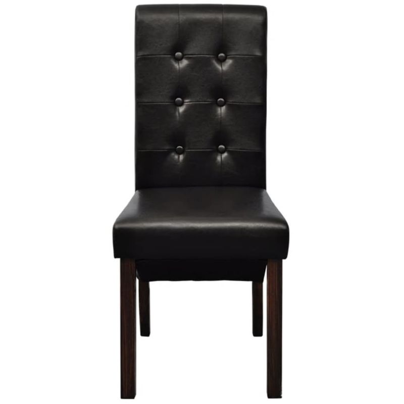 Този комплект от 6 удобни и големи трапезни стола има античен дизайн и ергономично оформени седалки и облегалки. Краката са изработени от масивна дървесина и лакирани в тъмнокафяв цвят, а ъглите са заоблени за безопасност. Столовете могат лесно да се поддържат и почистват. Седалките и облегалките на тези трапезни столове са подплатени с издръжлива синтетична кожа. Максимално 110 кг на седалка. Съобразете се с риска от открит огън и други източници на силна топлина в близост до продукта.