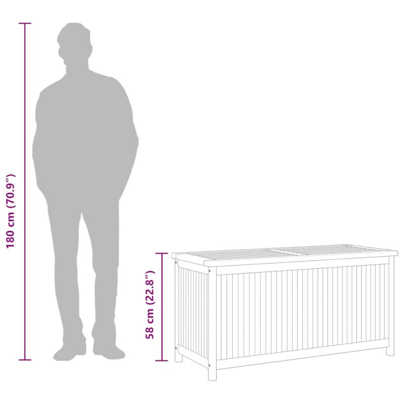 С лесно отварящ се капак тази градинска кутия ви дава достатъчно място за съхранение на инструменти и други пособия.Първокласен материал: Масивната тикова дървесина е красив естествен материал. Той е обветрен, изсушен в пещ и след това фино шлифован, за да му се придаде много гладък вид. Тиковото дърво е много здраво и устойчиво на атмосферни влияния.Много пространство: Просторният сандък на тази градинска кутия може да се използва за съхранение на възглавници, градински инструменти и други аксесоари, като същевременно поддържате съдържанието организирано.Полезни аксесоари: Вътре има PE торба. Много е полезно да поставите нещата в тази торба, за да бъдат сухи.Приложими случаи: Тази градинска кутия е идеална за градината, навеса и гаража. Добре е да се знае:За да удължите живота на вашите градински мебели, препоръчваме ви да ги защитите с водоустойчиво покривало.