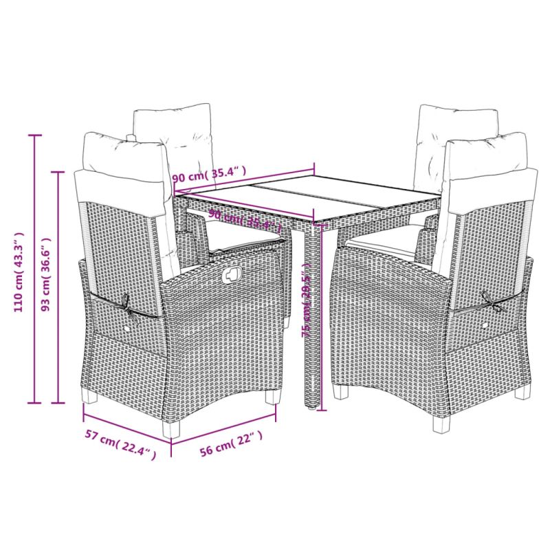Този градински трапезен комплект е чудесен избор за вечеря на открито или просто за почивка в градината, задния двор или вътрешния двор. Издръжлив материал: PE ратан, известен също като полиратан, е здрав синтетичен материал с малко необходима поддръжка, който прилича на естествен ратан. Той е лек, лесен за почистване и често се използва за външни мебели поради своята издръжливост и устойчивост на атмосферни влияния. Регулируема облегалка: Този градински стол има дръжка. Можете да регулирате облегалката във всяка позиция чрез издърпване на дръжката и бързо да я върнете в първоначалната ѝ позиция.Стъклен плот: Плотът на външната маса е изработен от здраво и издръжливо закалено стъкло, което улеснява почистването с влажна кърпа и добавя нотка елегантност към вашето външно пространство. Удобна седалка: Тази мебел за открито, снабдена с плътно подплатени възглавници, предлага удобство при сядане. Калъф, който може да се сваля и може да се пере: Тези възглавници за седалки имат подвижни калъфи за лесно пране и поддръжка. Добре е да се знае:За да сте сигурни, че вашите външни мебели ще останат красиви, ви препоръчваме да ги защитите с водоустойчиво покривало. Максимално 110 кг на седалка. Съобразете се с риска от открит огън и други източници на силна топлина в близост до продукта.
