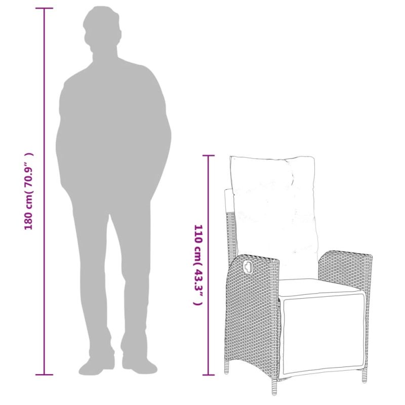 Този градински трапезен комплект е чудесен избор за вечеря на открито или просто за почивка в градината, задния двор или вътрешния двор. Издръжлив материал: PE ратан, известен също като полиратан, е здрав синтетичен материал с малко необходима поддръжка, който прилича на естествен ратан. Той е лек, лесен за почистване и често се използва за външни мебели поради своята издръжливост и устойчивост на атмосферни влияния.Регулируема облегалка и поставка за крака: Този градински стол има дръжка. Можете да регулирате облегалката и поставката за крака във всяка позиция чрез издърпване на дръжката и бързо да ги върнете в първоначалните им позиции.Удобна седалка: Тази мебел за открито, снабдена с плътно подплатени възглавници, предлага удобство при сядане.Калъф, който може да се сваля и може да се пере: Тези възглавници за седалки имат подвижни калъфи за лесно пране и поддръжка. Възглавниците за облегалките имат калъф отзад за лесно закрепване към облегалките.Стъклен плот: Плотът на външната маса е изработен от здраво и издръжливо закалено стъкло, което улеснява почистването с влажна кърпа и добавя нотка елегантност към вашето външно пространство. Добре е да се знае:За да сте сигурни, че вашите външни мебели ще останат красиви, ви препоръчваме да ги защитите с водоустойчиво покривало. Максимално 110 кг на седалка. Съобразете се с риска от открит огън и други източници на силна топлина в близост до продукта.