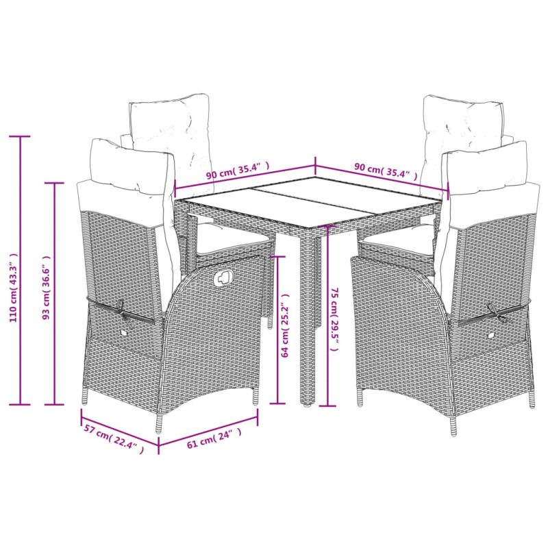 Този градински трапезен комплект е чудесен избор за вечеря на открито или просто за почивка в градината, задния двор или вътрешния двор. Издръжлив материал: PE ратан, известен също като полиратан, е здрав синтетичен материал с малко необходима поддръжка, който прилича на естествен ратан. Той е лек, лесен за почистване и често се използва за външни мебели поради своята издръжливост и устойчивост на атмосферни влияния.Регулируема облегалка и поставка за крака: Този градински стол има дръжка. Можете да регулирате облегалката и поставката за крака във всяка позиция чрез издърпване на дръжката и бързо да ги върнете в първоначалните им позиции.Удобна седалка: Тази мебел за открито, снабдена с плътно подплатени възглавници, предлага удобство при сядане.Калъф, който може да се сваля и може да се пере: Тези възглавници за седалки имат подвижни калъфи за лесно пране и поддръжка. Възглавниците за облегалките имат калъф отзад за лесно закрепване към облегалките.Стъклен плот: Плотът на външната маса е изработен от здраво и издръжливо закалено стъкло, което улеснява почистването с влажна кърпа и добавя нотка елегантност към вашето външно пространство. Добре е да се знае:За да сте сигурни, че вашите външни мебели ще останат красиви, ви препоръчваме да ги защитите с водоустойчиво покривало. Максимално 110 кг на седалка. Съобразете се с риска от открит огън и други източници на силна топлина в близост до продукта.