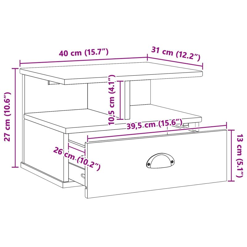 Това стеннополно шкафче предлага елегантно и спестяващо пространство решение за всяка съвременна всекидневна. С минималистичния си вид, допълва интериора с чисти линии и функционален дизайн. Проектирано е за хора, които ценят стил и практичност, това шкафче е идеално за съхраняване на лични вещи до леглото. Стенната му конструкция оставя пода свободен, което е чудесно за по-малки пространства. Масивна борова дървесина: Нощното шкафче е направено от здрава масивна борова дървесина, известна с издръжливостта и красивата си текстура. Този материал внася уют и обещава дълготрайна употреба. Солидната конструкция гарантира, че дори при промяна на вкусовете, шкафчето остава вечен акцент в стаята. Включени телени рафтове: Шкафът предлага удобство за организиране без да заема място. Идеален е за съхранение на книги, устройства или декорации, правейки шкафчето практично и стилно. Телесната структура осигурява вентилация, намалявайки натрупването на прах. Удобство за монтаж на стена: Проектирано е за стенен монтаж, освобождавайки ценно подово пространство. Идеално е за малки апартаменти и по-големи стаи, които искат минималистичен вид. Инсталацията е лесна с отвертка, което прави интеграцията в жилището безпроблемна. Съвременен стил: С простата си форма и функционалност, шкафчето се вписва в много различни декори, от съвременни до традиционни. Минималистичният му подход подобрява темата на стаята, без да затъмнява другите елементи. Инструкции за поддръжка: Поддръжката е лесна; просто избърсвайте шкафа с влажна кърпа, за да го запазите в страхотно състояние. Тази простота на грижа гарантира, че шкафчето ще изглежда добре и привлекателно, правейки го безпроблемно допълнение към вашето домашно обзавеждане.