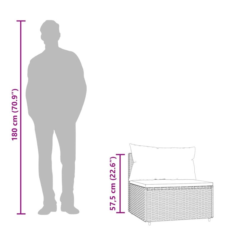 Тези модерни градински средни дивани, отличаващи се с елегантен и съвременен дизайн, са подходящи за вечеря или почивка във вашата градина. Материал, устойчив на атмосферни влияния: PE ратан, известен също като полиратан, е устойчив на атмосферни влияния и лесен за почистване. Той остава красив отвън за дълъг период от време. Предлага отлично качество, удобство и естетичен вид.Здрава рамка: Прахово боядисаната стоманена рамка прави дивана здрав и стабилен за ежедневна употреба на открито.Модулен дизайн: Външният диван е гъвкав и лесен за преместване, така че можете да го комбинирате с други модулни сегменти от уеб магазина, за да създадете свои лични конфигурации на градински лаундж комплект!Удобно седене: Облегалката добавя повече комфорт при седене на градинския диван. Освен това дебело подплатените възглавници осигуряват комфорт по време на седене. Добре е да се знае:За да бъде сглобяването възможно най-лесно, всеки продукт се доставя с ръководство. Забележка:Продуктът е предназначен само за употреба на открито. Не го съхранявайте на закрито.За да сте сигурни, че вашите външни мебели ще останат красиви, ви препоръчваме да ги защитите с водоустойчиво покривало. Максимално 110 кг на седалка.