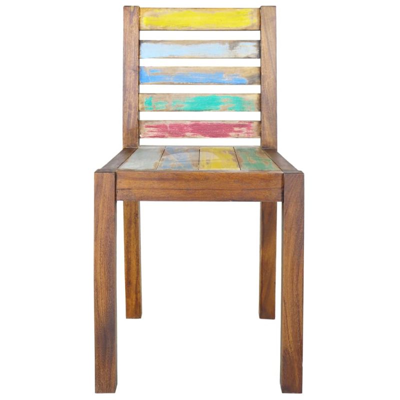 Тези дървени трапезни столове във винтидж стил ще добавят антично усещане и ще бъдат непреходно допълнение към декора на вашата трапезария. Столовете са ръчно изработени от масивна регенерирана дървесина – комбинация от регенерирани дървени материали, включващи тик, манго, бор, бук и др. Тези дървесини са рециклирани от стари сгради, като фабрики, навеси и лодки. Това ги прави фантастичен екологичен вариант за производство на мебели. Тъй като всяко изделие се изработва ръчно, цветовете варират, като се открояват много оттенъци в синьо, зелено, червено и жълто. Това означава, че всяко изделие е уникално! Важна забележка: Цветът и шарките на дървото могат да варират, което прави всяка мебел уникална и малко по-различна от останалите. Доставката е на случаен принцип. Максимално 110 кг на седалка.