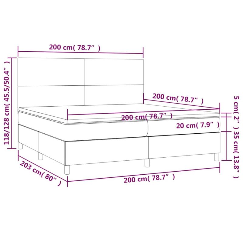 Използвайте това боксспринг легло с матрак и LED, за да се насладите на спокоен сън! Това е централната точка на вашата спалня. Меко кадифе: Кадифето е мека и луксозна материя, която се отличава с гъста купчина равномерно отрязани влакна за гладка повърхност. Кадифената тъкан се отличава с меко усещане, което я прави приятна на допир.Практична табла за глава: Горната табла за легло се регулира на височина според вашите предпочитания. Горната част на леглото ви осигурява отлична опора за гърба, докато седите в леглото, за да четете или гледате телевизия.Цветна LED лента: Внесете игриви нотки в тъмнината с цветни LED светлини!Покет пружинен матрак: Вградените индивидуални покет пружини са известни с много високото си качество, като същевременно осигуряват високо ниво на издръжливост и адаптивност. Те могат ефективно да абсорбират шума и ударите, причинени от мятане и въртене.Благоприятен за кожата топ матрак: Протекторът за матрак има издръжлива, както и щадяща кожата материя, което я прави мека и удобна. Забележка:От хигиенни съображения матракът не може да бъде върнат, ако опаковката е отстранена или отворена.Само частта със символ на ножица може да бъде изрязана и само частта с USB ще продължи да функционира както преди.Всеки продукт се доставя с ръководство за сглобяване в кашона за лесно сглобяване.Продуктът има USB конектор, но не е включен сертифициран източник на захранване от 5V USB. Този продукт се захранва с DC 5V, но сертифицираният 5V USB източник на захранване не е включен в комплекта. По-високото напрежение може да доведе до прегряване на устройството и да доведе до повреда на устройството и потенциален риск от прегряване и пожар.