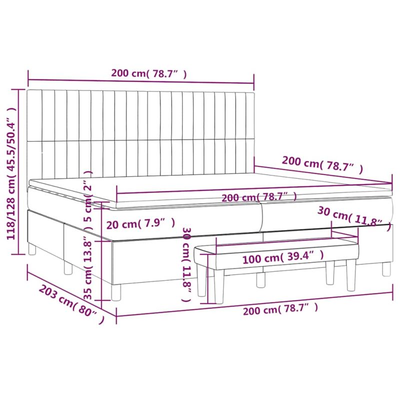 Използвайте това боксспринг легло, за да се насладите на спокоен сън! Предлага ви максимален релакс и приятен сън. Меко кадифе: Кадифето е мека и луксозна материя, която се отличава с гъста купчина равномерно отрязани влакна за гладка повърхност. Кадифената тъкан се отличава с меко усещане, което я прави приятна на допир.Практична табла за глава: Горната табла за легло се регулира на височина според вашите предпочитания. Горната част на леглото ви осигурява отлична опора за гърба, докато седите в леглото, за да четете или гледате телевизия.Покет пружинен матрак: Вградените индивидуални покет пружини са известни с много високото си качество, като същевременно осигуряват високо ниво на издръжливост и адаптивност. Те могат ефективно да абсорбират шума и ударите, причинени от мятане и въртене.Средно твърда поддръжка: Матракът за легло перфектно осигурява допълнителна стабилност и точното ниво на твърдост, без да се жертва комфорта. Така той е идеален за спящи по гръб или корем.Благоприятен за кожата топ матрак: Протекторът за матрак има издръжлива, както и щадяща кожата материя, което я прави мека и удобна.Многофункционална пейка: Тази пейка може да служи като допълнително място за сядане във вашия дом. Също така може да се използва като пейка в края на легло. Забележка:От хигиенни съображения матракът не може да бъде върнат, ако опаковката е отстранена или отворена.Всеки продукт се доставя с ръководство за сглобяване в кашона за лесно сглобяване.