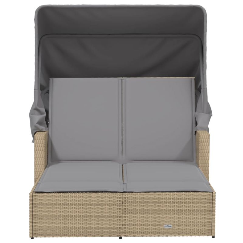 Двоен шезлонг със сенник и възглавници бежов микс полиратан