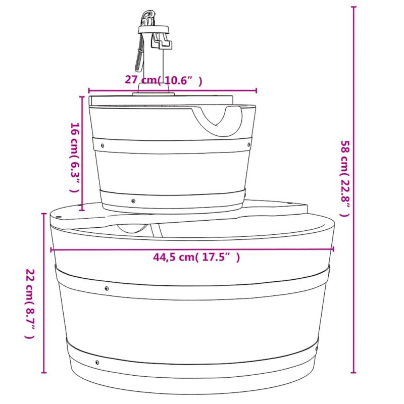 Този дървен фонтан е отлично допълнение към вашия заден двор, вътрешен двор и градина, превръщайки дома ви в уникален пейзаж. Чамовото дърво масив: Масивното чамово дърво е красив естествен материал. Чамовата дървесина не изсъхва и не се деформира, когато е изложена на влага.Удобна електрическа помпа: Вградената водна помпа изпраща водата надолу обратно нагоре, за да образува ефективна циркулация на водата, така че не е необходимо да допълвате нова вода ръчно. Можете също така да регулирате силата на водния поток, като използвате превключвателя на помпата.Декоративна функция: Течащата вода създава радостна оптична и акустична среда, която създава рустикална и елегантна атмосфера за вашата градина. В допълнение, каскадният фонтан ще покани по-малки животни като птици и катерици да посетят вашата градина.Здрава и стабилна рамка: Дървената рамка на градинския фонтан гарантира здравина и стабилност. Добре е да се знае:За да бъде сглобяването възможно най-лесно, всеки продукт се доставя с ръководство. Този уред не е предназначен за използване от лица (включително деца) с намалени физически, сетивни или умствени способности или с недостатъчен опит и познания, освен ако не са получили надзор или инструкции за използването на уреда от лице, отговорно за тяхната безопасност. Този продукт не е играчка. Не позволявайте на деца да си играят с уреда.