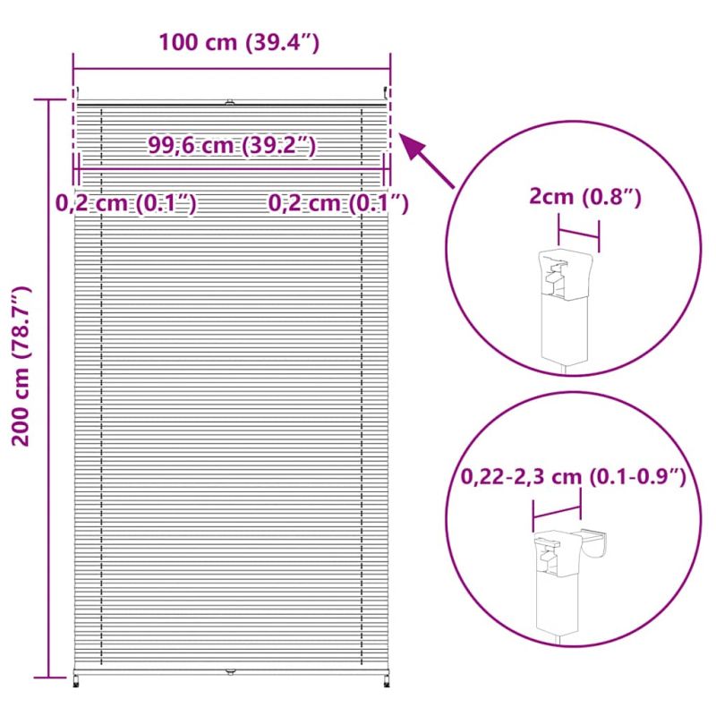 Тази плисирана щора е идеална за защита от слънце и външно наблюдение. Тя може да се регулира от отдолу и отгоре, за да задоволи вашите потребности при най-различни поводи и нужди. Модерните плисета, подобни на вълни, създадени от бриза на морето, ограничават визията отвън, но и са отлична декорация за вашата стая. Плисираната щора се монтира с помощта на затягащ държач, без да се пробива стената, прозореца или вратата, идеална е за вилата, всекидневната, спалнята, банята, кухнята, трапезарията, офиса, заседателната зала, приемната и др. Предлага се в различни размери:40 x 100, 50 x 100, 60 x 100, 70 x 100, 80 x 100, 90 x 100, 100 x 100, 110 x 100 40 x 125, 50 x 125, 60 x 125, 70 x 125, 80 x 125, 90 x 125, 100 x 125, 110 x 125 40 x 150, 50 x 150, 60 x 150, 70 x 150, 80 x 150, 90 x 150, 100 x 150, 110 x 15040 x 200, 50 x 200, 60 x 200, 70 x 200, 80 x 200, 90 x 200, 100 x 200, 110 x 200Може да намерите тази, която ще подхожда най-добре на вашия дизайн. ВНИМАНИЕ! Малките деца могат да бъдат удушени от примки в дърпащи въжета, вериги, ленти и вътрешния кабел, който управлява този продукт. За да избегнете удушаване и оплитане, дръжте кабелите далеч от обсега на малки деца. Шнурите могат да се увият около врата на детето. Преместете леглата, креватчетата и мебелите далеч от въжетата за покриване на прозорци. Не завързвайте кабелите заедно. Уверете се, че кабелите не се усукват и образуват примка. ВНИМАНИЕ! Децата може да се задушат, ако това предпазно устройство не е инсталирано. Винаги използвайте това устройство, за да задържате шнуровете или верижките на място, недостъпно за деца. GPSR