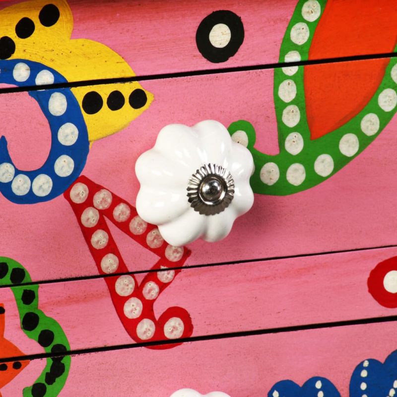 Тази уникална, красива конзолна маса ще добави цвят и ще се превърне в акцент на вашата всекидневна или спалня. С удивителния си дизайн тази ръчно боядисана конзолна маса няма да остане незабелязана, когато поканите гостите. Масата е ръчно изработена от мангово дърво, което е едновременно трайно и красиво, а майсторската изработка добавя към впечатляващия ѝ ретро стил. Тя е с богати декоративни ръчно изрисувани детайли, които излъчват елегантност и подчертават изискания външен вид. Отличителните дръжки улесняват отварянето на чекмеджетата и придават стил на масата. Конзолната маса има 4 чекмеджета и осигурява достатъчно пространство за съхраняване на предмети. Цветният плот е идеален за поставяне на декоративни елементи, като вази, фотоалбуми, кошници за плодове и др. Сглобяването е лесно.