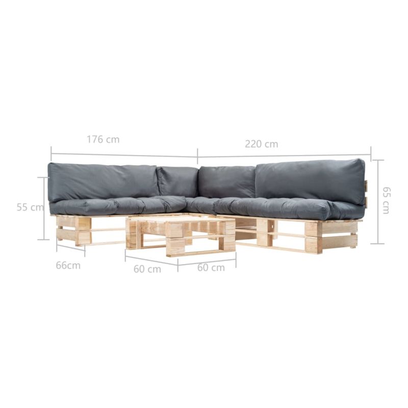 Градински мебели от палети 4 части със сиви възглавници дърво