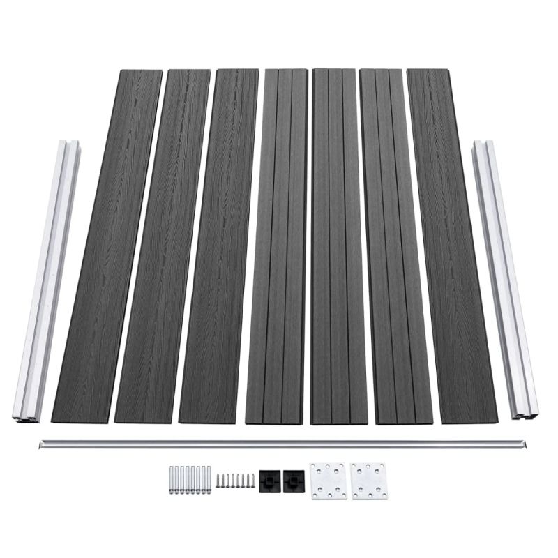 Този панелен комплект за ограда може да се използва като градинска бариера или жилищна ограда за неприкосновеност и сигурност. Изработена от WPC (дървонапълнен полимерен композит), градинската ограда е издръжлива и устойчива на гниене или ръжда. Градинската преграда има принт на дървесни шарки от едната страна и обикновен принт от другата страна, така че можете да изберете дизайна, който ви харесва повече. Благодарение на алуминиевия горен профил, дъските на оградата могат да бъдат плътно прикрепени една за друга, което увеличава тяхната твърдост и здравина при удар. Проектирани с модулната система, дъските за ограда са лесни за инсталиране и ви позволяват свободно да разширявате оградата. Тези стълбове имат три слота, които ви позволяват да сглобите оградата по различни начини – в права линия (180 градуса), под прав ъгъл (90 градуса) или в „Т“ -форма. Многофункционалните стоманени крачета могат да бъдат фиксирани по два начина. Първият е като ги завиете върху повърхност с помощта на приложените анкерни винтове. Вторият начин е чрез закрепването им в циментова основа с помощта на шип за земя (не е включен).