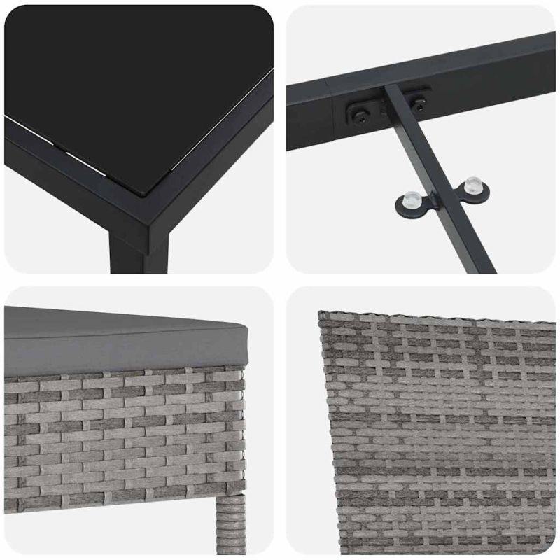 Този луксозен градински комплект е за всички, които искат да добавят малко стил на открито. С красиви линии и минималистичен дизайн, той прави всяка градина или тераса да изглеждат страхотно. Комплектът позволява различни конфигурации, удобно за всяко събиране, от расслабящи закуски до романтични вечери. Качествени материали: Изработен от премиум полиратан, известен с изключителната си издръжливост и устойчивост на дъжд и бързо съхнене. Издръжлива конструкция: Прахово боядисаната стомана на рамката гарантира стабилност и сила, което я прави идеална за всякакви климатични условия. Модерни характеристики: Комплектът се отличава с представителен гръб и удобни, отстранима възглавница с цип за лесна поддръжка. Универсалност: Идеален за градини и тераси, той е подходящ за всякакви събития - от семейни вечери до приятелски партита. Лесна поддръжка: За да удължите живота на комплекта, използвайте калъф, когато не е в употреба. Максимално 110 кг на седалка. Съобразете се с риска от открит огън и други източници на силна топлина в близост до продукта.