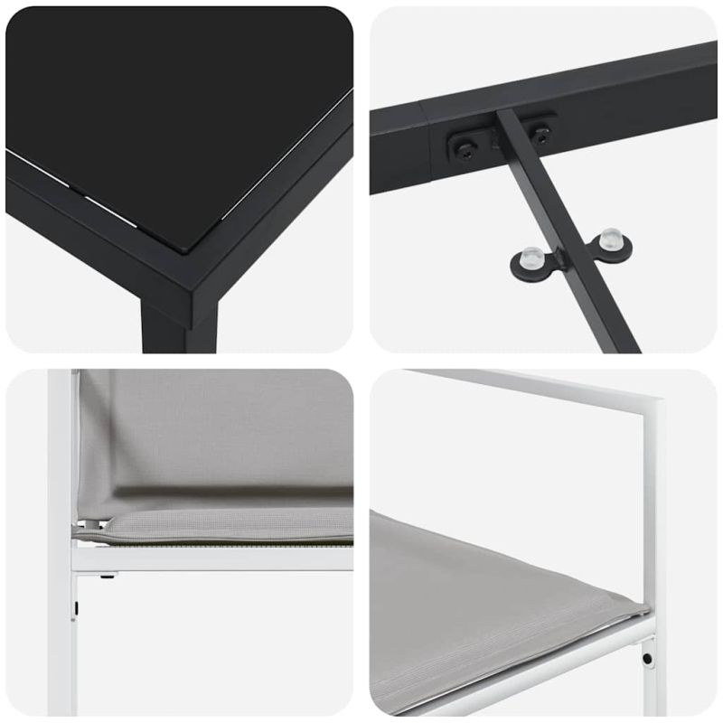 Този модерен градински комплект е комбинация от простота и функционалност, предоставяйки приятно пространство за социализация на открито. Идеален за пролетно и летно релаксиране, комплектът има минималистичен стил с чисти линии, който отлично се вписва в избрана градина или тераса. Представете си как посрещате приятелите за хранене на открито в това удобно обкръжение. Черната рамка контрастира с текстурите, приласкайки гостите да се отпуснат и да се включат в общуването. Материали: Градинският комплект е изработен от текстилена тъкан, известна със своята бързосъхнеща и устойчива функция, гарантираща комфорт и дълготрайност. С термообработено стъкло, той предлага гладка и привлекателна повърхност за хранене. Включени компоненти: Комплектът идва с елегантна завършваща част, добавяща стил. Седалките имат цип за удобно сваляне и поддръжка, а черният им цвят идеално се интегрира в съвременния дизайн на открито. Функции /Дизайн: Изработен с UV устойчиви материали, комплектът запазва външния си вид, устоявайки на слънчевите лъчи. Регулируемата височина на седалките осигурява индивидуален комфорт и огатяване. Препоръчителни употреби: Градинският комплект е идеален за всякакви открити пространства, създавайки център за социални взаимодействия. Универсалният му дизайн е съвместим с разнообразни събития, предлагайки приветствана обстановка. Поддръжка: Използвайте покривало за предпазване в неактивни периоди и редовно проверявайте и почиствате, за да запазите визуалната и структурната издръжливост, осигурявайки дългосрочна употреба. Максимално 110 кг на седалка. Съобразете се с риска от открит огън и други източници на силна топлина в близост до продукта.