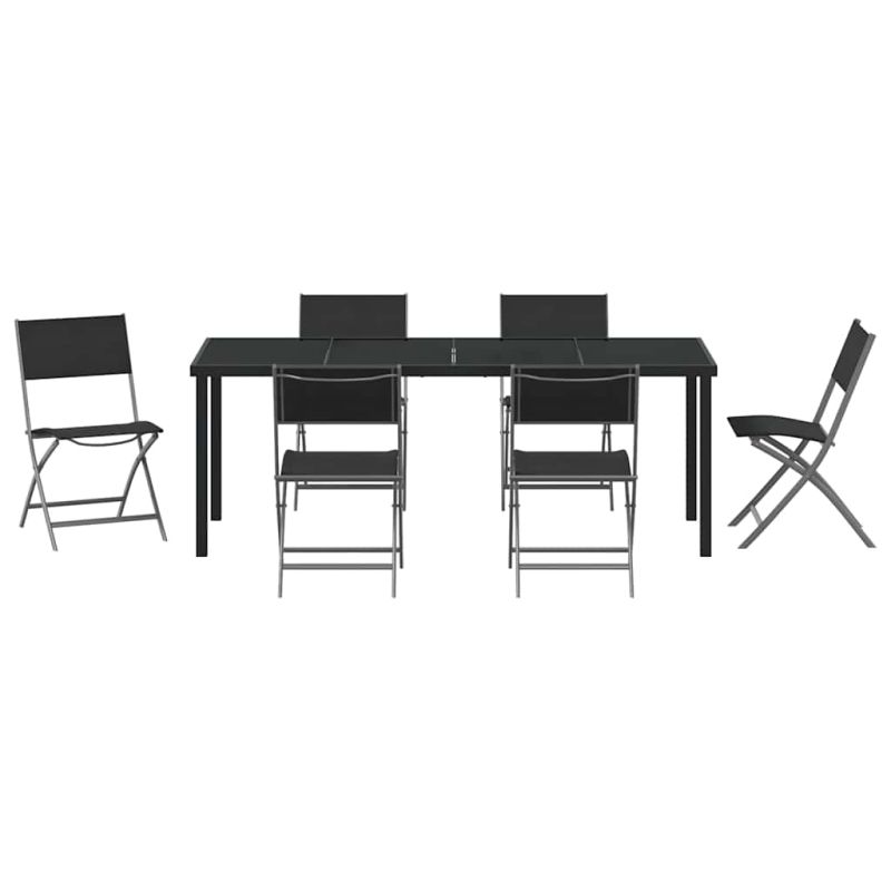 Съвременният комплект за хранене на открито е тук, за да направи всяко пространство за хранене приятно и стилно. Съчетава се идеално с градината или терасата и предоставя широко место за отдих и хранене на открито. Комплектът е с елегантна черна цветова схема за максимална простота и функционалност, подходящ за всеки, който обича минимализма. Материали: Изработен от устойчива на време прахово боядисана стомана и закалено стъкло, комплектът е стилен и здрав. Седалките от текстилене бързо съхнат, така че можем да го ползваме без притеснение. Включени компоненти: Комплектът за хранене включва правоъгълна маса и сгъваеми столове, които са удобни и създадени за продължителни вечери. Всички части отлично се вписват в елегантния стил на открито. Функции/ функционалност/ дизайн: Височината на мебелите може да се регулира, за да осигури максимален комфорт. Освен това, сгъваемият дизайн ги прави лесни за съхранение, което е супер удобно при организиране на събития. Препоръчителни употреби: Идеален е за всякакви открити пространства, от сутрешно кафе до вечерни сбирки с приятели. Универсалният му дизайн е подходящ за градински вечери и тераси. Грижа и поддръжка: Поддържай комплекта в перфектно състояние, като използваш покривало, когато не го ползваш. Така ще защитиш мебелите от времето и ще ги запазиш за години напред. Регулярното почистване е лесно и гарантира дълъг живот на комплекта. Максимално 110 кг на седалка.