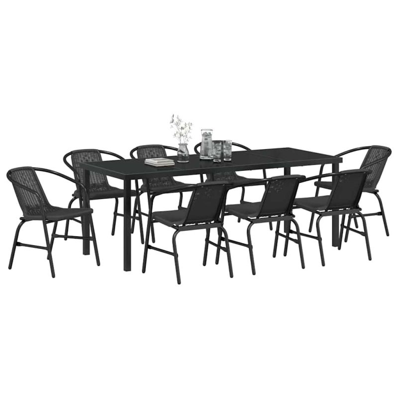 Този стилен комплект градинска маса и столове съчетава елегантност и функция, внасяйки визуална привлекателност с черната си прахово боядисана стоманена рамка. Създаден за открито, той се вписва лесно в градини и тераси, идеален за хранене на открито. Комплектът е подходящ за срещи, предоставяйки приятна обстановка за неформално релаксиране или официални поводи. Формата му и стилът му добавят ценност на всяка открита площ, ставайки централна точка за приятели и семейство да се наслаждават на изчистените линии в дизайна. Качествени материали: Стоманената рамка с прахово боядисване осигурява добра издръжливост и защита от избледняване. Удобният полиратан предлага прекрасна текстура и комфорт. Комбинацията от тези материали осигурява дълготрайност и е инвестиция за открито. Добре дефинирани компоненти: Завършената задница предоставя перспектива от всички ъгли, като интегрира естетика в различни обстановки. Прахово боядисаните подлакътници са удобни, а стъклените повърхности добавят изисканост, лесни за почистване и практични за хранене на открито. Функционални характеристики: Комплектът е проектиран за дълготрайност и организит, който предлага лесно сглобяване и интуитивна употреба. Правоъгълната форма и минималистичен дизайн го правят идеално допълнение за всякакви поводи за хостване. Универсално използване: Подходящ за пролетни и летни събирания, комплектът добре пасва за елегантни градински партита или спокойни семейни вечери на открито. Съвместимостта му през сезона позволява многообразие от неподходящи открити пространства за приятно преживяване на хранене на фона на природата. Лесна грижа и поддръжка: За да поддържате външния вид на комплекта, използвайте покривала, когато не е в употреба, за да предотвратите естественото износване. Редовното почистване е лесно и осигурява дълготрайна привлекателност и функционалност на комплекта за хранене. Максимално 110 кг на седалка.