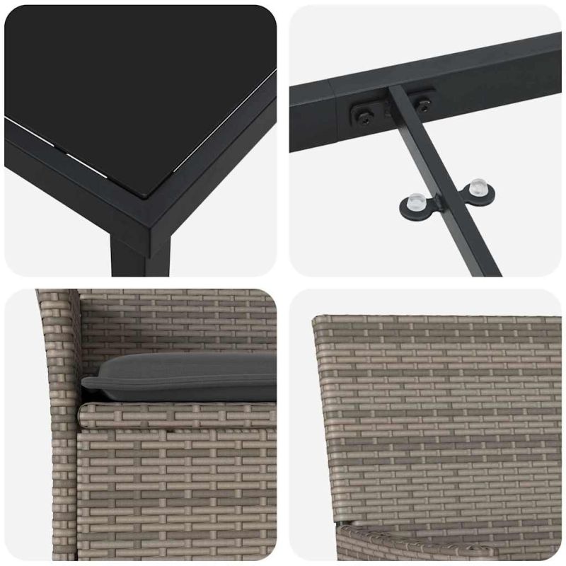 Модерният комплект за хранене на открито е перфектно практично допълнение за всяко пространство навън, предлагащо елегантно решение за хранене. Този комплект съчетава простота с функционалност, което го прави идеален за градини и тераси. Чистите линии и минималистичните детайли отразяват съвременния стил, който лесно се вписва в различни външни пространства, а издръжливите материали са перфектни за летни условия. Стилна рамка от полиратаан Рамката е изработена от полиратаан, който е известен със своята съвременна естетика и устойчивост на времето. Обещава дълготрайност и модерен стил, а също така е лесна за поддръжка, поради което е отличен избор за открито. Стъклен плот, устойчив на времето Комплектът е с закалено стъклено плот, което издържа на всякакви метеорологични условия. Стъклото добавя елегантен вид и осигурява здрава и гладка повърхност, идеална за хранене и развлечения. То лесно се вписва в всяка градина или тераса. Удобни възглавници Включва възглавници с подвижни, миещи се калъфи за лесно почистване. Пяната в възглавниците увеличава комфорта и позволява незабравими летни следобеди или вечери с приятели. Функционални подлакътници Столовете имат полиратаанови подлакътници, които предлагат ергономична поддръжка, добавяйки допълнителен комфорт. Те изглеждат модерно и са много удобни за ежедневна употреба. Персонализируемо разположение Леките и прахово боядисани стоманени крака улесняват пренареждането, когато е необходимо. Сглобяването е лесно и се нуждае само от отвертка и двама души, позволяваща настрояване за различни поводи. Максимално 110 кг на седалка. Съобразете се с риска от открит огън и други източници на силна топлина в близост до продукта.