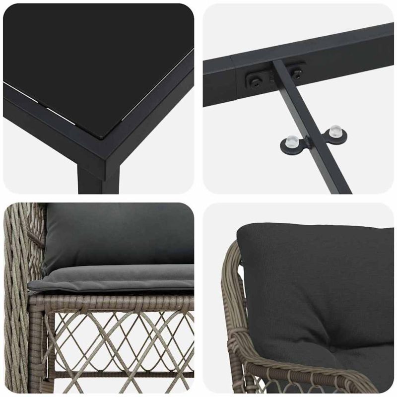 Комплектът Modern за хранене в градината съчетава стил и уют с прахово боядисана стомана и полиратан. Неговият минималистичен дизайн прави всяко хранене на открито приятно. Приветливата обстановка е идеална за събирания с близки на слънчеви тераси или в градина. Този комплект добавя модерен акцент във вашето пространство и прави всяко ястие повод за празнуване. Модерна конструкция: Изработен от прахово боядисана стомана и полиратан, този комплект е здрава, но и визуално привлекателна. Устойчив на атмосферни условия и гарантира свеж вид. Удобство: Включва възглавници от устойчива на времето материя, с подвижни калъфи, които улесняват поддръжката. Стъклена маса: Chic закалена стъклена маса, която добавя стил и удобство, лесна за почистване. Лесна поддръжка: Използвайте покритие, когато не е в употреба – така ще предпазите комплекта от атмосферните условия. Ергономични подлакътници: Меките полиратанови подлакътници осигуряват комфорт по време на храненето. Идеален е за незабравими моменти с приятели или семейство. Максимално 110 кг на седалка. Съобразете се с риска от открит огън и други източници на силна топлина в близост до продукта.