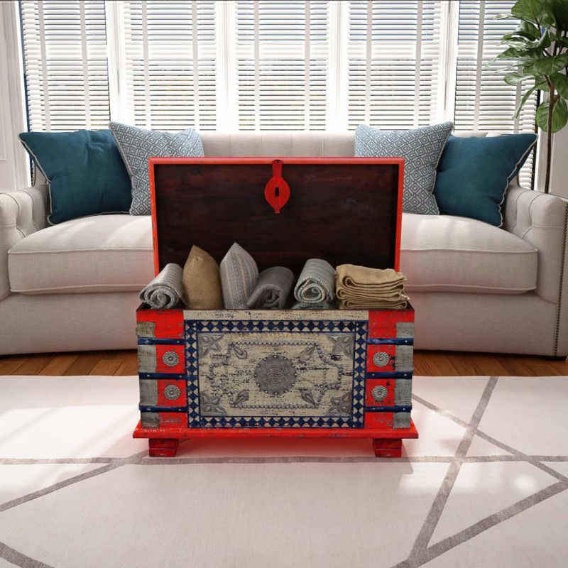 Тази ракла за съхранение в антикварен стил ще направи уникално допълнение към вашата стая. Масивната й дървесна конструкция я прави стабилна и надеждна за поставяне на напитки, кошници за плодове или декоративни елементи върху плота. Когато отключите ковчежето (заключването не е включено в доставката), можете лесно да съхранявате голям брой неща вътре. Може да се използва и като декоративен сандък или масичка за кафе. Изработена от мангово дърво, масата/ракла е твърда, издръжлива и красива. Античната ориенталска орнаментика и декоративни елементи придават на всяка мебел своята собствено история и уникален вид. Тази индийска ракла е изцяло ръчно изработена. Всяка стъпка от процеса на направата се извършва с най-голяма грижа, било то полиране, боядисване, лакиране или украсяване с антични довършителни работи.