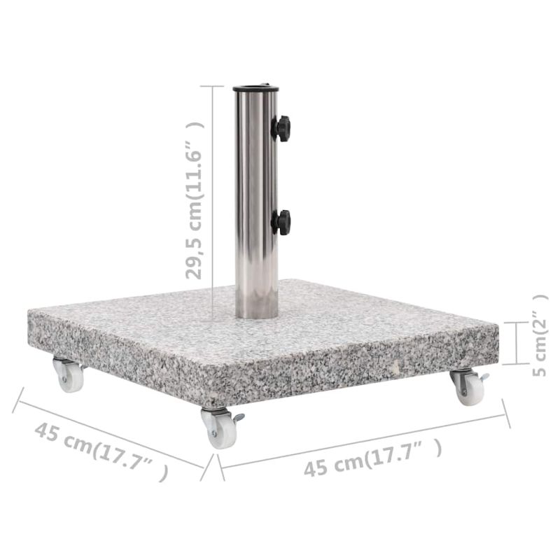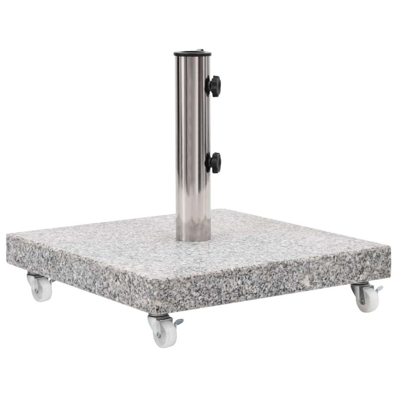 Нашата масивна гранитна стойка за чадър осигурява здрава и стабилна основа за задържане на чадъра ви и за предпазването му от преобръщане или издухване. Изработена от здрав гранит и с тегло 30 кг, тази основа за чадър е изключително стабилна и гарантира, че чадърът ви ще остане неподвижен дори и при силен вятър. Стойката за чадър е с 2 заключващи болта, които да държат пръта на чадъра на мястото му. Включен е и адаптер, което прави държача за чадър подходящ за пръти на чадъри с диаметър от 38/48 мм. При това 4-те колелца позволяват на основата за чадър да се мести свободно.