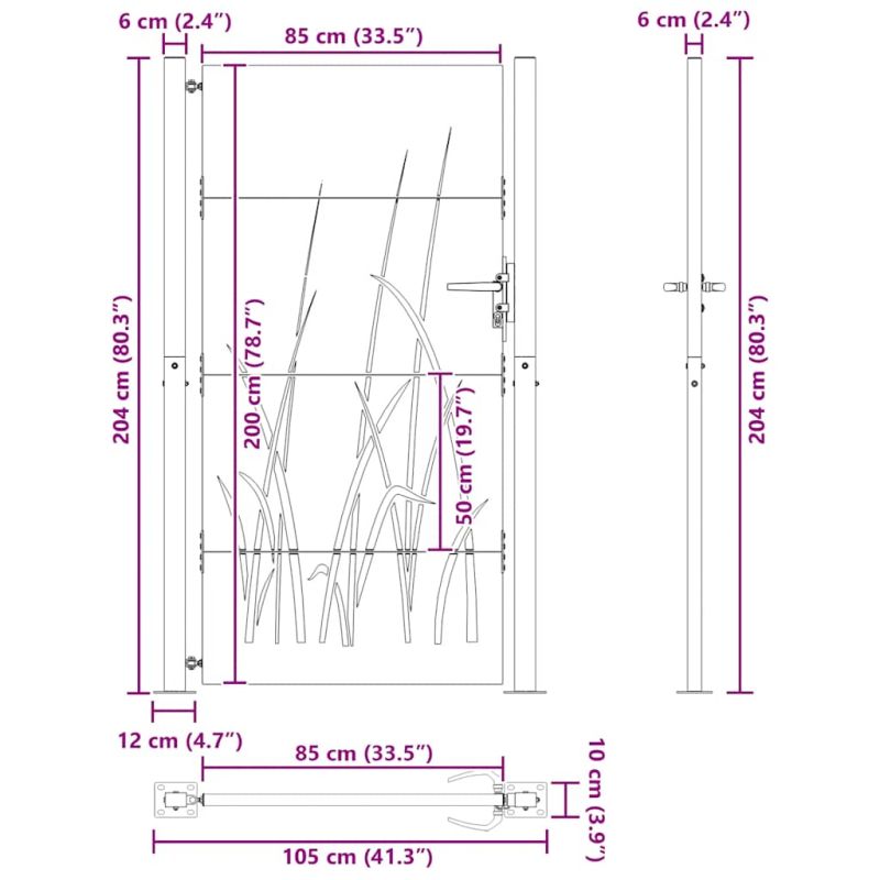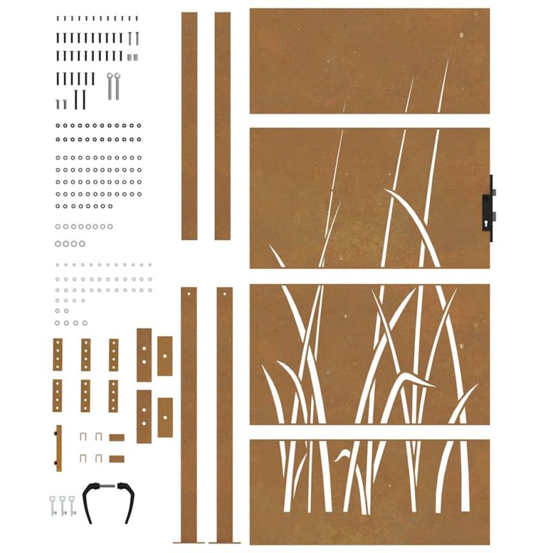 Тази градинска порта, отличаваща се с перфектна комбинация от здравина и елегантност, е идеална врата за оградата около вашата градина или вътрешен двор. Издръжлив материал: Металната врата е изработена от кортенова стомана. Кортенова стомана, известна също като патинираща стомана. Тя е антикорозионна по своята същност. Развива ръждив защитен слой срещу корозия при първото излагане на атмосферни условия. Следователно не е необходимо да я боядисвате. Това може да ви помогне да спестите разходи за поддръжка и ремонт. Отличителният кафяв цвят на кортеновата стомана със сигурност ще привлече вниманието. И накрая, патиниращата стомана е изключително издръжлива и ще издържи изпитанието на времето. Лазерно изрязан дизайн: Страничната порта има красив лазерно изрязан дизайн, който добавя специален чар към вашия дом.Заключваща се система: Стоманената порта е оборудвана със заключваща се система за допълнителна сигурност.Стабилна основа: 4-те монтажни отвора в основата на стълба на портата ви позволяват да го фиксирате към земята за допълнителна стабилност. Добре е да се знае:Този продукт трябва да бъде сглобен.Този продукт все още не е ръждясал и когато го получите ще има нормален метален цвят, но ръждата ще се появи с течение на времето. Можете да ускорите процеса на ръждясване, като го напръскате със сапунена и солена вода. За да запазите дрехите си от петна, избягвайте контакт с образуващия се слой ръжда.