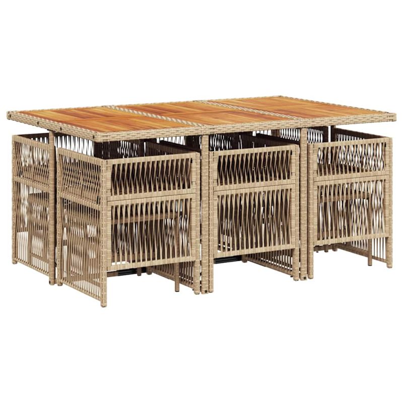 Този градински трапезен комплект е чудесен избор за вечеря на открито или просто за почивка в градината, задния двор или във вътрешния двор. Издръжлив материал: PE ратан, известен също като полиратан, е здрав синтетичен материал с малко необходима поддръжка, който прилича на естествен ратан. Той е лек, лесен за почистване и често се използва за външни мебели поради своята издръжливост и устойчивост на атмосферни влияния.Компактно съхранение: Тези столове имат падаща облегалка, която може да се сгъва, което улеснява съхранението им под масата. Когато са сгънати, те се побират под масата, оформяйки спестяваща място форма на куб. Освен това табуретките могат да се съхраняват и под столовете, което допълнително увеличава ефективността на пространството.Удобна седалка: Тази мебел за открито, снабдена с плътно подплатени възглавници, предлага удобство при сядане.Калъф, който може да се сваля и може да се пере: Тези възглавници имат подвижни калъфи за лесно пране и поддръжка. Калъфките за възглавници имат калъф отзад за лесно закрепване към облегалките.Стабилен и лесен за почистване плот: Тази градинска маса има плот от акациево дърво, който е здрав, издръжлив и лесен за почистване с влажна кърпа. Добре е да се знае: За да сте сигурни, че вашите външни мебели ще останат красиви, ви препоръчваме да ги защитите с водоустойчиво покривало.