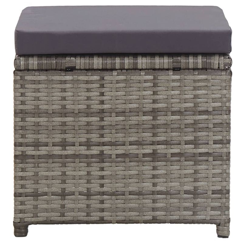 Този комплект от 2 табуретки с компактен и модерен дизайн ще се превърне в чудесно и практично допълнение към вашата градина, тераса или вътрешен двор. Конструкцията не изисква особена поддръжка и е изработена от прахово боядисана стомана и полиратан, които гарантират нейната здравина, трайност и издръжливост на прокъсване и износване. Дебелите възглавници ще подобрят комфорта ви при седене. Благодарение на височината им, градинските табуретки са универсални и могат да се използват като поставки за крака. Поглезете се във времето за почивка, независимо дали ще седите или ще повдигнете краката си на тази удобна ратанова табуретка. Доставката включва 2 табуретки с възглавнички. Максимално 110 кг на седалка. Съобразете се с риска от открит огън и други източници на силна топлина в близост до продукта.