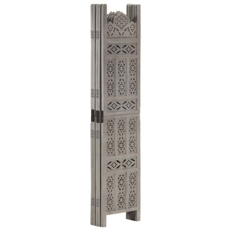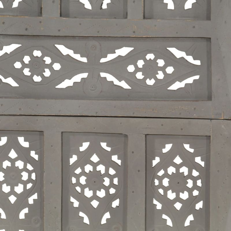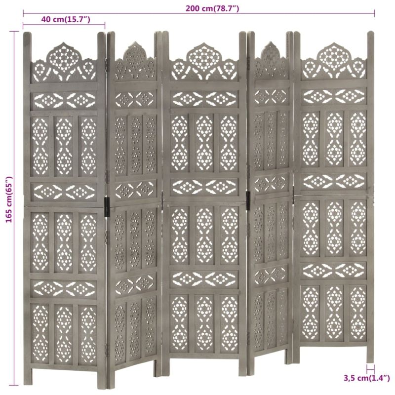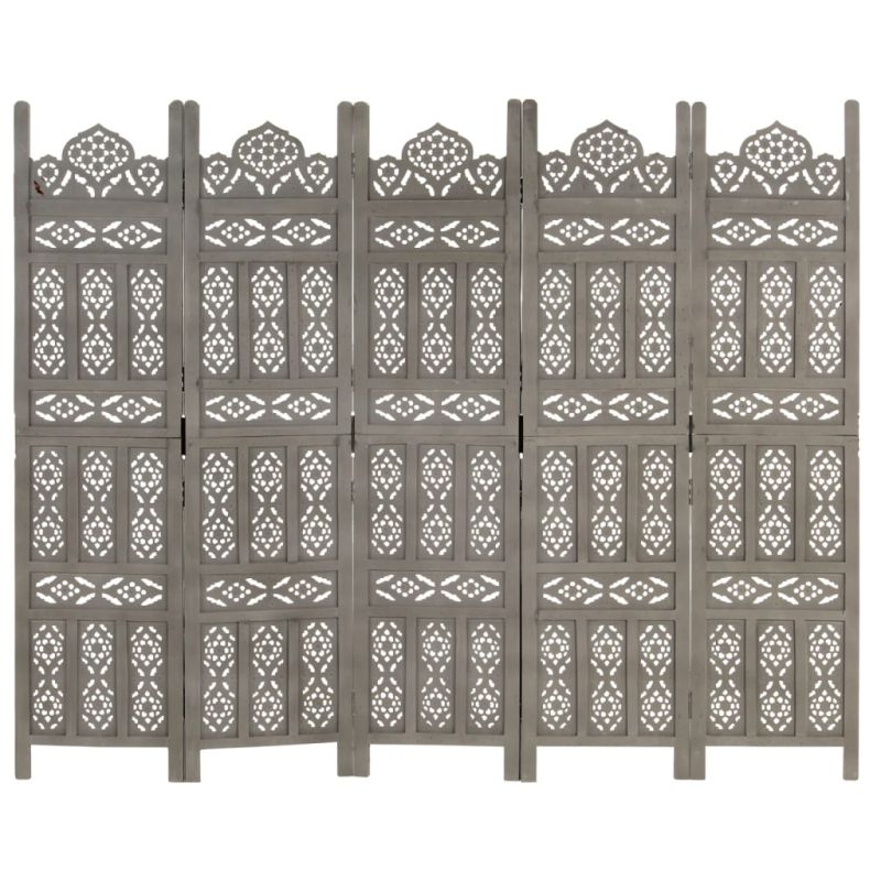 Ръчно резбован параван, 5 панела, сив, 200x165 cм, манго масив