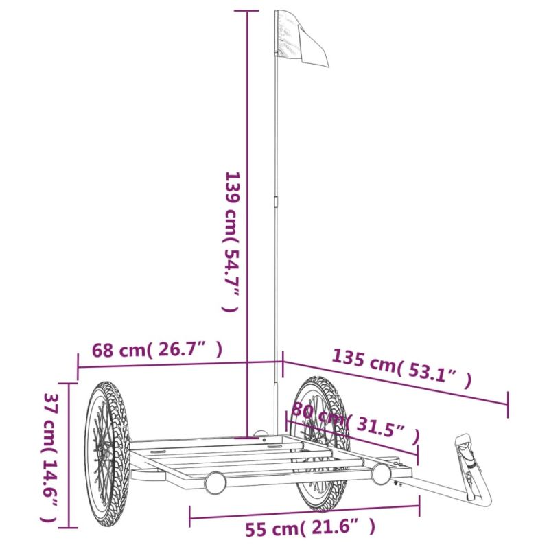 Това универсално и здраво ремарке за велосипеди ще бъде идеално за транспортиране на тежки товари благодарение на максималната си товароносимост от 45 кг. Здрав материал: Желязото е здрав и твърд материал. То е солиден фаворит в промишленото и мебелното строителство. Изработено от желязо, това товарно ремарке за велосипеди е много здраво и издръжливо.Практичен дизайн: Това ремарке за велосипед с максимална товароносимост от 45 кг е идеално за теглене на тежки товари като багаж, растения, инструменти или хранителни стоки.Внимателен дизайн: Ремаркето за велосипеди има теглич, който улеснява свързването му с велосипед. В същото време е включен предпазен флаг за допълнителна видимост. Възможно е да има законови изисквания за осветление, рефлектор и т.н. в зависимост от местоположението. Спазвайте местните и законовите изисквания.