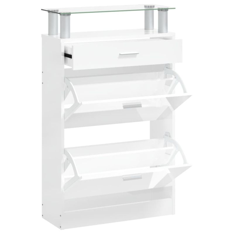 Този шкаф за обувки с модерен и стилен дизайн е отлична мебел за организирано съхранение на вашите обувки. Подходящ е за антре, фоайе, хол, спалня и други места, където желаете да го поставите. Издържлив материал: Инженерната дървесина е с изключително качество с гладка повърхност и също така се отличава със здравина, стабилност и устойчивост на влага.Достатъчно място за съхранение: Тази етажерка за обувки разполага с 3 чекмеджета, осигуряващи достатъчно място, където да държите обувките си подръка и добре подредени.Дизайн с падащо чекмедже: Със своя дизайн с падащо чекмедже този шкаф за обувки се отваря и затваря лесно.Практичен плот: Здравият горен стъклен рафт на шкафа за обувки е идеален за излагане на декоративни предмети, фоторамки или саксийни растения. Забележка:Всеки продукт се доставя с ръководство за сглобяване в кашона за лесно сглобяване. Внимание:За да се предотврати преобръщане, този продукт трябва да се използва с предоставената приставка за стена