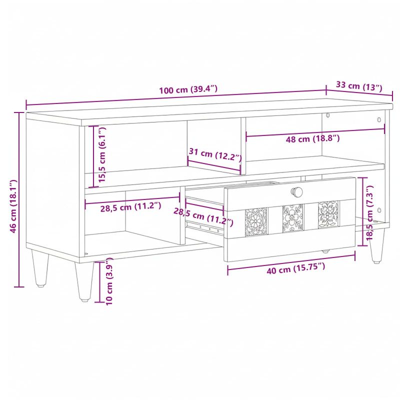 Това модерно ТВ шкафче носи простота и чисти линии, които съчетават функционалност и стил, правейки го идеално за всеки хол. Проектирано е да се вписва в съвременния интериор и предлага както красота, така и практичност в съхранението. Минималистичната форма прави обстановката организирана и повишава настройката на развлекателната зона. Масивна мангова дървесина: Изработено от мангово дърво, шкафчето е устойчиво и красиво, добавяйки органичен шик в пространството. Този материал осигурява дълготрайност и стабилност при ежедневна употреба, дори в натоварен хол. Стилни чекмеджета с дръжки: Чекмеджета с елегантни дръжки за лесен достъп до вещите, правейки организирането лесно. Те поддържат медийните аксесоари и вашето пространство подредени. Рафтове от плоскости за гъвкаво съхранение: Шкафчето разполага с рафтове за максимално оползотворяване на пространството. Подходящо за медийни устройства, книги или декорации, рафтовете предлагат гъвкави опции, запазвайки чистоо видовете. Завършена задна стена: Задната част е не само функционална, но и атрактивна, с MDF, което допълва цялостната визия. Превърта визуализацията на шкафа, когато стои сам в стаята. Сглобяването е необходимо: Има ясни инструкции за сглобяване с помощта на отвертка, което прави процеса лесен и бърз. Идеално за проект през уикенда.