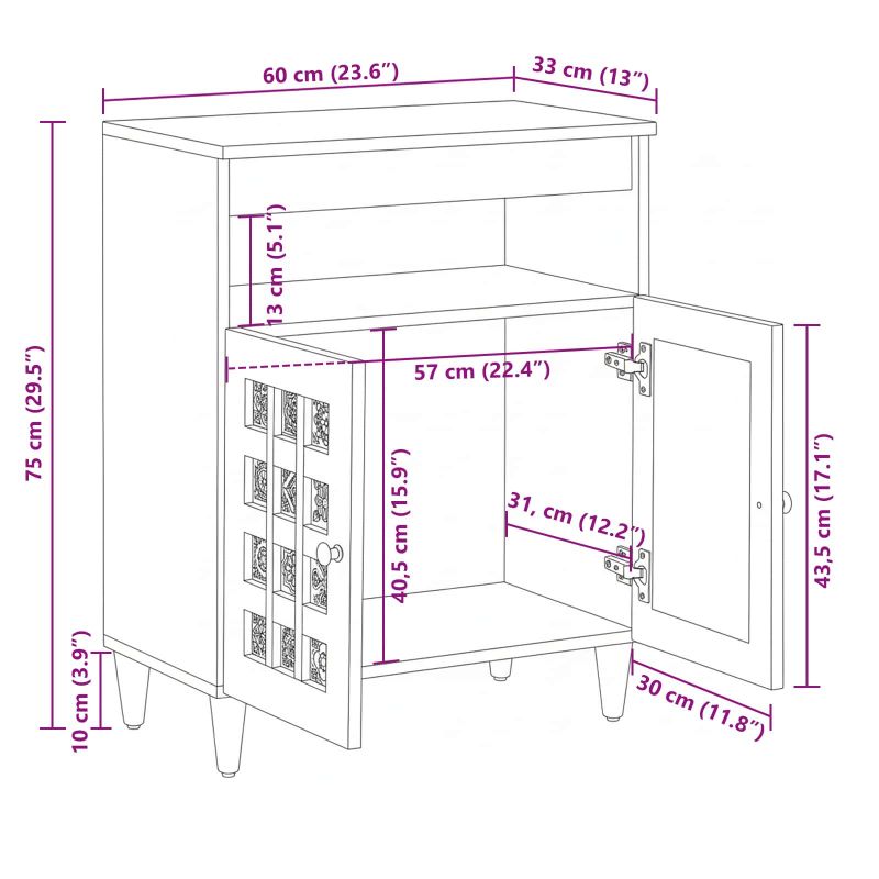 Този модерен шкаф елегантно комбинира простота с функционалност и е основно решение за съхранение в трапезарии и дневни. С изчистени линии и минимална декорация, предлага съвременен вид, идеален за всякакъв интериор. Незаменим е за всеки, който търси стил и практичност в един.“ Издръжлива конструкция: Направен е от масивно мангово дърво, осигурява дълготрайност и е устойчив на ежедневна употреба. Здравите материали придават стабилност и икономичен вид, добавяйки красота на вашия интериор. Насладете се на качествена изработка. Интелигентни врати с панти: Лесни за отваряне, позволяват достъп до съдържанието. Перфектен за съхранение на трапезни принадлежности или аксесоари, запазвайки всичко организирано и извън погледа. Модерен стил: Изчистен и минималистичен, идеално допълва различни домашни стилове. Фокусира се върху функционалността без да жертва естетика. Оптимално използване на пространството: Предлага организирано съхранение на важните вещи, без да заема много място. Идеален за натоварени домове, нуждаещи се от ред с елегантност. Лесно сглобяване: Изисква само основна отвертка за сглобяване от двама, включва всички необходими компоненти и инструкции, за да вкарате бързо функционалност в стаята си.