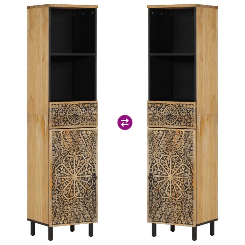 Този шкаф за баня е чудесен избор за вашата баня, като я прави подредена и организирана! Масивна мангова дървесина: Масивната дървесина от манго е здрава тропическа дървесина, от която се произвеждат здрави мебели. Красивите ѝ дървесни шарки правят всяка мебел малко по-различна от следващите. Изработен от масивно мангово дърво, шкафът за баня е издръжлив и стабилен.Достатъчно място за съхранение: Този шкаф за баня предлага достатъчно място за съхранение, за да държите най-важните си вещи добре подредени и на една ръка разстояние.Гъвкава врата: Можете да инсталирате вратата или от лявата, или от дясната страна според собствените си нужди.Здрави крака: Железните крака добавят здравината и стабилността на шкафа за баня.Ретро стил: Този шкаф за съхранение с ръчно издълбани флорални шарки внася лукса на ретро стила във вашия интериор, като е централната точка на вашата стая. Добре е да се знае:Всеки артикул е уникален с вариации в цветове и зърна. Доставката е на случаен принцип, което гарантира ексклузивността и индивидуалността на вашия продукт. Внимание:За да предотвратите преобръщане, този продукт трябва да се използва с предоставеното устройство за закрепване на стена.