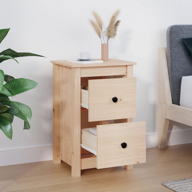 Това класическо дървено нощно шкафче, отличаващо се с елегантен дизайн, е непреходно допълнение към вашия интериорен декор. Борово дърво масив: Това странично шкафче е изработено от борово дърво масив. Масивната борова дървесина е красив естествен материал. Боровата дървесина е с продълговати шарки, а чеповете придават на материала характерния му рустик вид.Достатъчно място за съхранение: Нощното шкафче разполага с две чекмеджета, които осигуряват достатъчно място за съхранение, за да държите дребните си предмети добре организирани и достъпни.Стабилен плот: Стабилната горна част на нощното шкафче е идеална за подреждане на вашите декоративни предмети, фоторамки и саксийни растения. Внимание:За да се предотврати преобръщане, този продукт трябва да се използва с предоставената приставка за стена. Забележка:Всеки продукт се доставя с ръководство за сглобяване в кашона за лесно сглобяване.