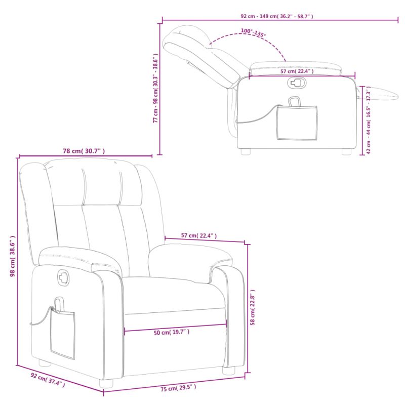 Облегнете се и се отпуснете в този изключително комфортен масажен наклоняем стол! Функция за ръчно накланяне: Този накланящ се стол има дръжка от дясната страна. Можете ръчно да настроите поставката за крака и облегалката до произволна позиция според вашето удобство с просто издърпване на дръжката. Тази функция позволява максимален наклон от 135 градуса. Освен това облегалката може бързо да се върне на първоначалното си място с лесно издърпване на дръжката.Функция за вибрация: Представените 6 масажни точки ви позволяват да изпитате по-целенасочен масаж. Освен това включеното ръчно управление ви позволява да избирате различни програми за масаж. Функцията за масаж се захранва от USB конектора, но сертифицираният 5V USB източник на захранване не е включен.Удобно седене: Дебело подплатената седалка, облегалката и широките подлакътници, покрити с текстил, осигуряват уютно и топло усещане, което ви кара да се чувствате като в прегръдка, докато седите. Тъканта се отличава със семпъл и изчистен вид и е дишаща и издръжлива.Удобен страничен джоб: Този фотьойл има страничен джоб за вашето дистанционно управление или за поддържане на вашите основни вещи леснодостъпни.Здрава и стабилна рамка: Рамката, изработена от дърво и метал, осигурява здрава структура и стабилност. Този накланящ се фотьойл е удобен и издръжлив. Максимално 110 кг на седалка. Този продукт се захранва с DC 5V, но сертифицираният 5V USB източник на захранване не е включен в комплекта. По-високото напрежение може да доведе до прегряване на устройството и да доведе до повреда на устройството и потенциален риск от прегряване и пожар.